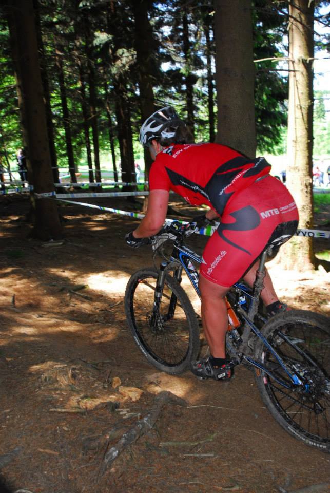 Zunächst kam ich gut rein und freute mich über die Trails. Zwei Abfahrten hing ich hinter einer 3er-Gruppe die etwas gebremster herabfuhr, ich wollte aber auch nicht so viel riskieren und im tiefen Gras überholen. Gut 5 km vor der Bobbahn hatte ich irgendwie eine kleine Schwächephase, kam etwas aus dem Fahrrythmus. Meine Bereifung war für den feuchten Untergrund mit einem Larsen TT hinten nicht optimal und so rutschte ich in Anstiegen einige Male durch. Ich wurde von einigen Startern passiert darunter auch gut 3 Frauen. Auch Kati überholte mich und wir plauschten kurz. Ich überlegte schon nach der Bobbahn aus dem Rennen zu gehen, weil die Beine schon nach gut 1 h ganz schön spürte. Doch in dieser Phase erkannte ich, dass ich vielleicht doch recht zügig unterwegs war und es hauptsächlich auf Grund des Tempos ein wenig weh tat. Und plötzlich gingen die Beine fast unbemerkt wieder auf und noch vor der Bobbahn zündete der Diesel erneut. Ich begann das Umfeld wieder zurück zu überholen.