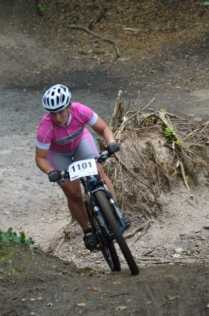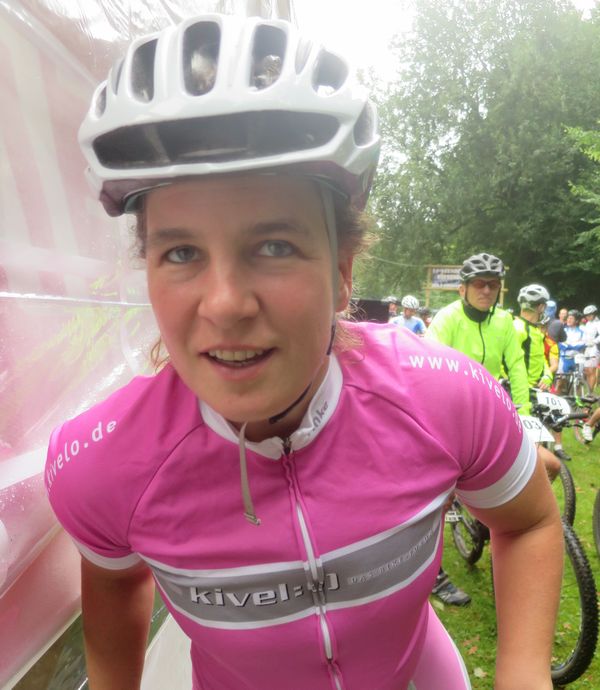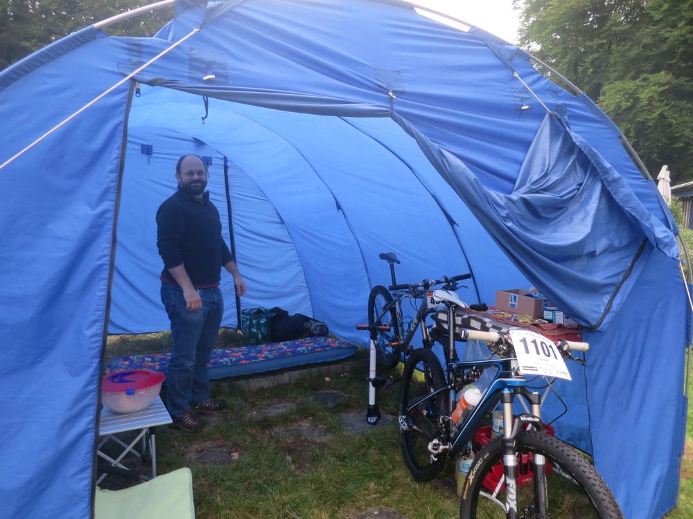 Doch nun zum Rennen, dessen Startschuss 13 Uhr fiel. Die ersten Runden legte ich in einem zügigen Tempo zurück, ohne wirklich ans Limit zu gehen. Meine Wattkurbel zeigte mir komische Werte, zu hohe Werte, die besser aussahen wenn ich auf dem kleinen Kettenblatt fuhr. Ich versuchte in den Anstiegen schön ruhig hochzufahren, nur leider konnte ich meiner Wattanzeigen nicht so richtig trauen. Auch ein Kalibrieren änderte an den Zahlen nix. 200 Watt im Schnitt auf der ersten Runde, das ist zu hoch, aber das fahr ich ja auch gar nicht. Ich versuchte mich also an meiner Atmung zu orientieren und merkte dass ich im längeren Anstieg doch immer etwas mehr gab, ohne dass es sehr auf die Beine ging. In den ersten Runden versuchte ich also ein Tempo zu finden, welches ich länger durchhalten können sollte. Martin verpflegte mich mit Flaschen und Gels am Zelt direkt an der Strecke, zwischendurch las er immer mal im Buch oder knippste paar Foto’s. Es lief also. Dann kam Runde 11, es waren etwa 2:30 h gefahren, als sich meine Kette völlig zwischen Speichen und Kassette verklemmte. Nur wenige Meter nach dem Zelt hieß es „rien ne va plus“, ich musste zurück laufen, das Werkzeug ansetzen und die Kassette ein Stück abziehen. Nach den 10 min machte ich nochmal etwa 10 min Pause, da ich ohnehin schon stand und gönnte mir ein bissel Baguett bevor es weiter ging. Keine so gute Entscheidung, denn just in Runde 12 begann es zu Regnen und zwar richtig dicker Platzregen. Die Strecke wurde ja auch einfach zu schnell. Ich legte noch ein paar Runden zurück und beschloss dann aber erstmal das Rad wieder gängig zu machen und etwas zu essen. Die Strecke war zu der Zeit extrem langsam, einige mussten auf Grund der Reifenwahl schon Passagen hinauf schieben. Auch das Licht baute ich bei der Gelegenheit gleich an. Ich wartete noch den ein oder anderen Schauer ab und dann begab ich mich nach 1:30 h wieder auf die Runde. Es war kurz vor 19 Uhr als ich den netten Plausch mit Jörn, der mit Freundin zum Zuschauen kam, auf der Strecke beendete und die nächsten Runden in Angriff nahm.