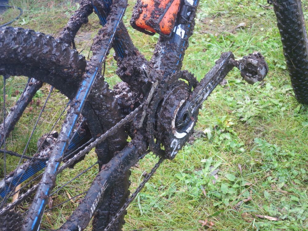 Ich hielt gute 5 Runden durch, in denen nicht viel passierte. Die Strecke war zäh zu fahren, die Rundenzeiten deuteten das auch an. Die Wattkurbel, der ich nun mehr vertrauen schenkte, zeigte mir 178er Runden an und der Puls spielte sich bei 142 Schlägen pro Minute ein. Eigentlich Werte, die ich eine Weile durchhalten könnte. Doch gegen 20 Uhr überkam mich Müdigkeit und es kam ein Gefühl von echter Langweile auf. So bislang nur einmal in einem MTBO in der Schweiz verspürt. Also pausierte ich eine Weile, denn die Arme waren vom Festhalten des Lenkers auch ganz schön müde. Es war anstrengend im Schlamm zu fahren und selbst bergab musste man treten. Martin hatte in der Zwischenzeit den Heizlüfter im Zelt in Betrieb genommen den nun auch ich genoss. Nach etwas Überredungskunst durch Felix per SMS machte ich mich gegen 21:30 Uhr in frischer Kleidung und mit frischen Kopf wieder auf die Strecke, die nun wieder etwas abgetrockneter und damit schneller war. Die Motivation war zurück auch wenn der Vorsprung gegenüber den anderen Frauen schon riesig war und ich selbst im Feld der Einzel-Männer an der Top5 knabberte. Weitere 13 Runden mit einem Radwasch-Zwischenstop legte ich bis 2 Uhr nachts zurück. Das Rad sammelte immer wieder viel klebrigen Schlamm auf, wurde schwer und schwergängig. Sobald die Strecke einen trockeneren und schnelleren Zustand erreichte kam ein neuer Schauer vom Himmel herab. Halb 2 war es mal wieder soweit. Ich bemerkte auch, wie die Hose auf der Haut arbeitete und beschloss vielleicht bald mal eine kleine Duschpause einzulegen, sowie frische Kleidung anzuziehen. Kurz danach hatte ich einen kleinen Kettenklemmer, rutschte über eine Mini-Wurzel direkt auf eine Bank zu und verpasste mir ne Beule am Knie. Da beschloss ich nun wirklich eine kleine Duschpause einzulegen und evtl. eine kleine Mütze Schlaf zu erhaschen. Die Dusche tat gut, schnell noch was gegessen und dann ab in den Schlafsack. Zu diesem Zeitpunkt lag ich bei den Einzel-Männern auf Platz 2.