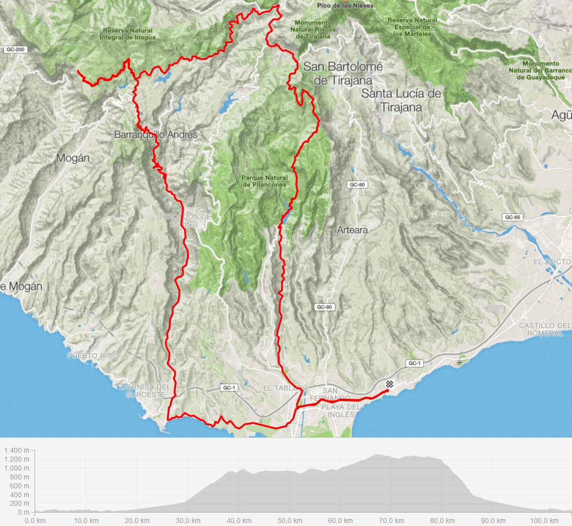 Nach einem Haufen Nudeln zogen auch wir weiter und machten uns auf zum Trail, der uns wieder hinab nach Maspalomas bringen sollte. Bis zum Stausee vom Vortag fuhren wir den Trail, dann trennten wir uns wieder auf. Harti und ich auf der Straße zurück. Benny zeigte Ulf noch den gestrigen Trail. Die 105 km reichten dann auch irgendwie und ich war abends ganz schön müde, wie lange nicht mehr.