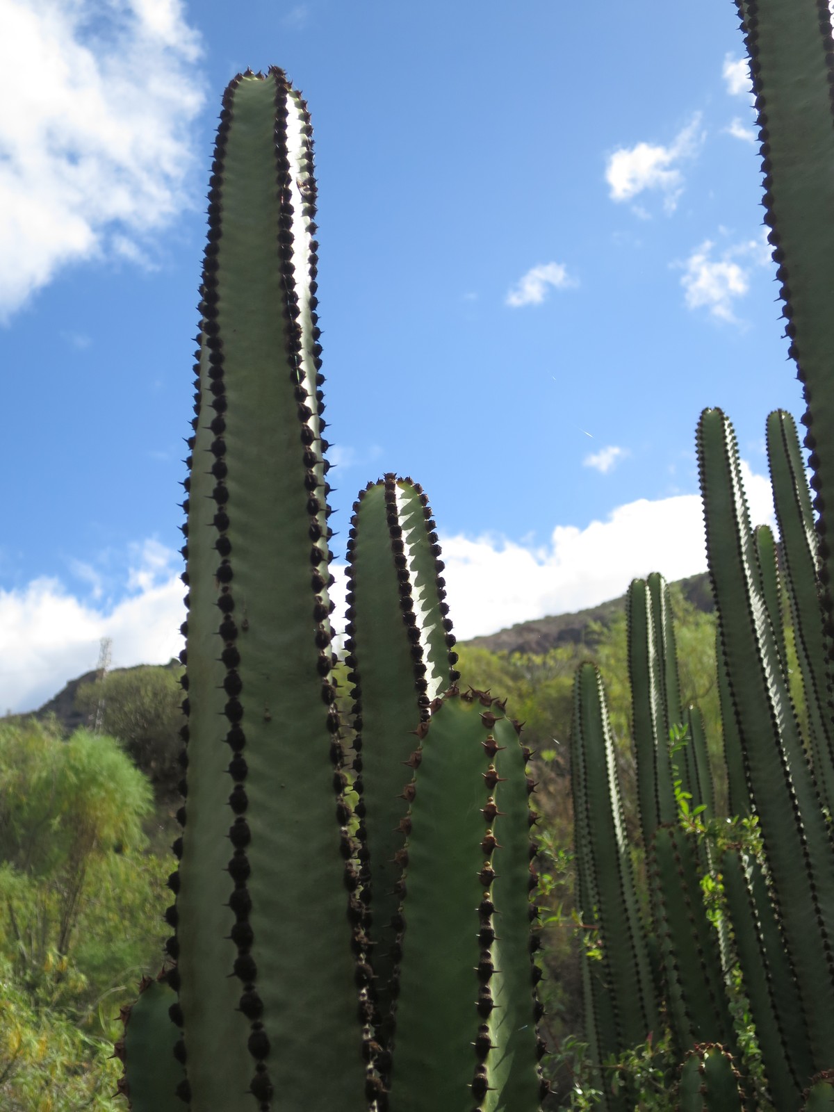 Gesagt getan, für den Aufstieg brauchten wir dann doch gut 4 h. Ganz unten fuhr ich mir einen Nagel ein. Zunächst störte mich nur das beharrliche Ticken, aber als ich dann anhielt um einen Kaktus zu fotographieren zischte es auf einmal. Als ich den Nagel weiter rein drücken wollte brach der Kopf ab und die Luft pfiff aus dem Mantel. Dank Tubeless ging es aber sogar ohne Nachpumpen weiter, denn die Milch verstopfte das relativ große Loch. Später, am ersten Pass, gabelten wir Benjamin wieder auf, der sich noch einen etwas längeren Anfahrtsweg durch ein Nebental suchte. Zusammen mit Benjamin wollte ich noch eine extra Schlaufe fahren, aber scheinbar hatten wir die Route falsch eingegeben und so trauten wir uns nicht weiter, weil der kaum markierte Weg möglicherweise einiges an Schiebepassagen hatte. Also zurück und auf der Straße weiter zu den anderen, die bereits in Ayacata in einem Café sassen. Zusammen mit einer großen Gruppe Norwegern und einigen Tschechen war der Laden gut gefüllt. Die Wirte gut bei Laune und sie wußten was man den Radlern gutes tun kann. Für die Abfahrt gab es sogar Papier, was man sich vorn unter das Trikot stecken konnte, damit es nicht zu kalt wird. Die Norweger hatten doch teilweise nur ein Kurzarm-Trikot an, was da oben in 1500 m Höhe und mit etwas Wind doch eher frisch gewesen sein durfte.