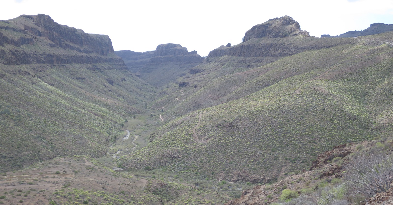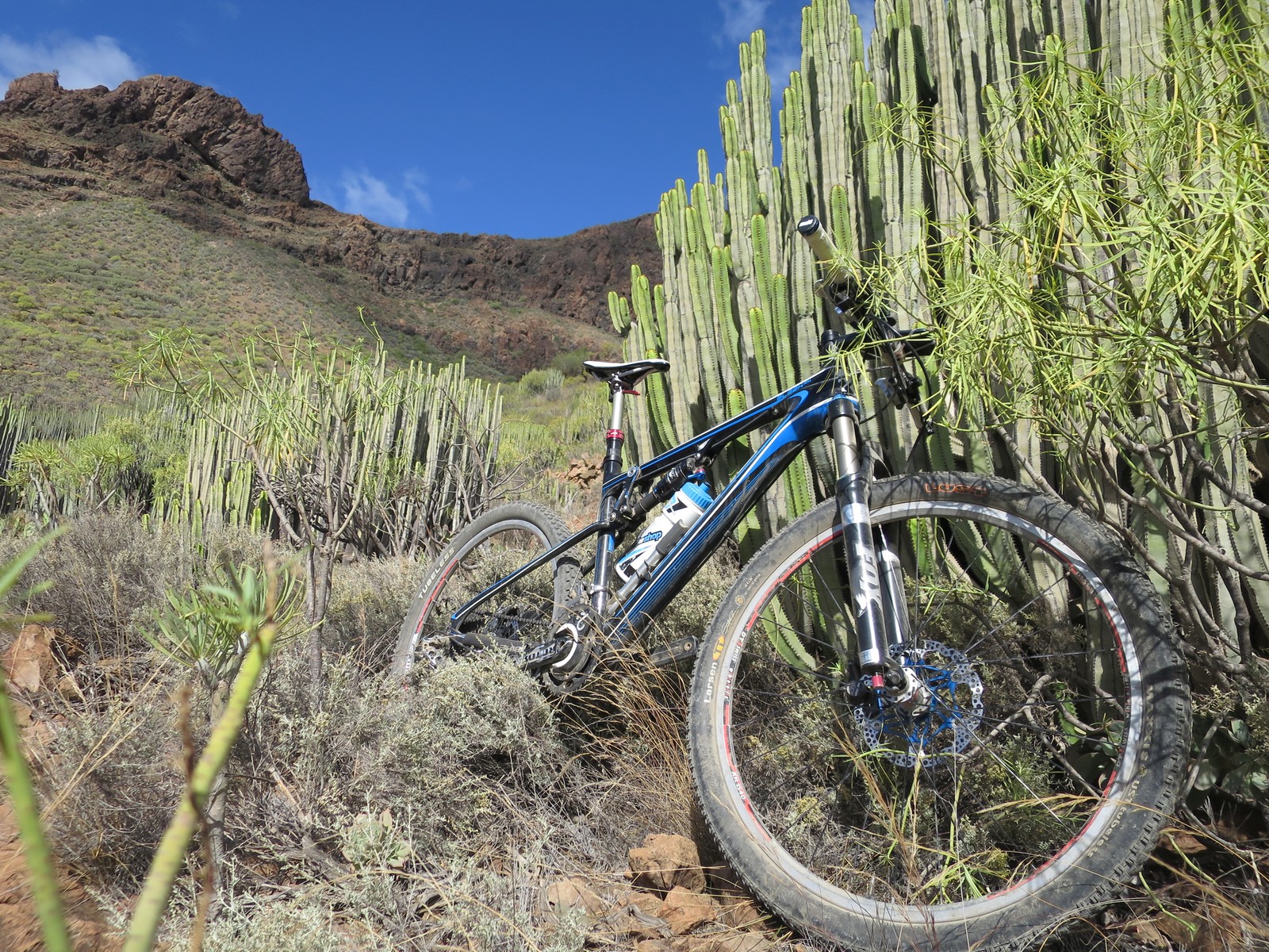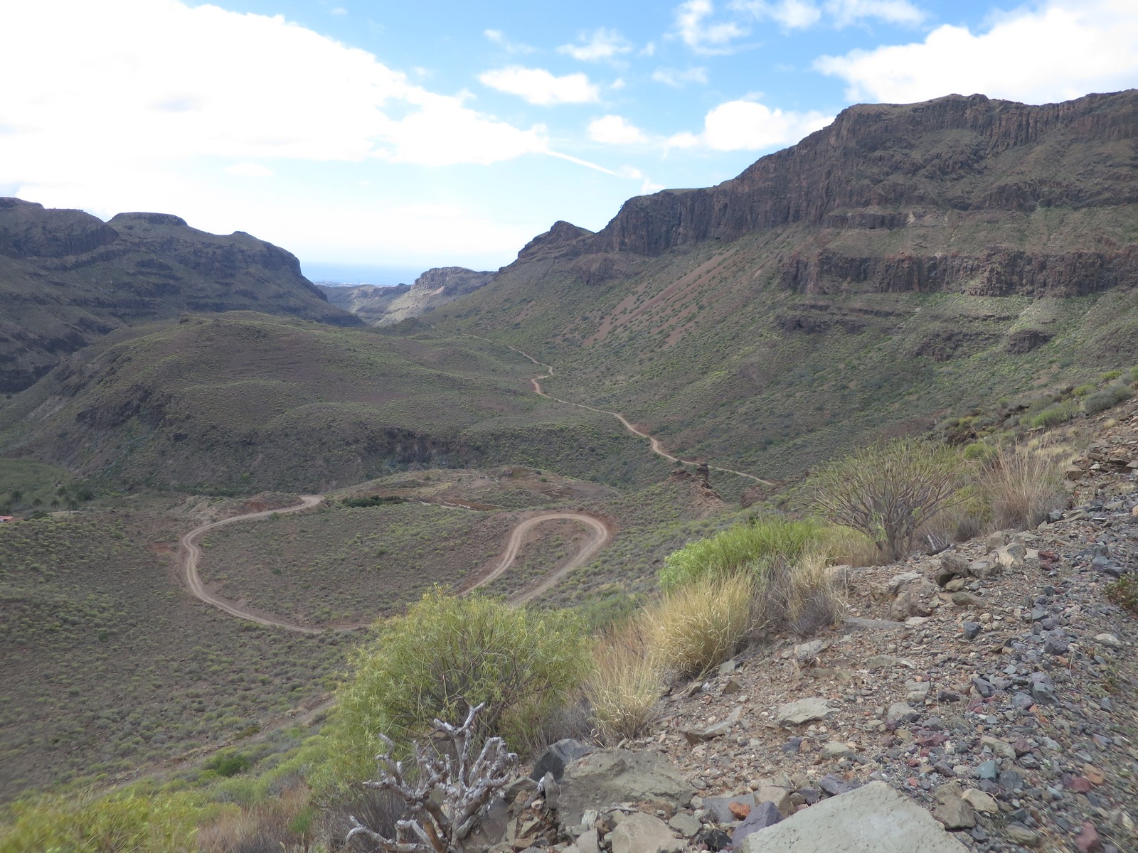 Ich fühlte mich etwas angeschlagen von den letzten Tagen und auch wenn es nur ein Gefühl war, ich wollte doch nicht riskieren mich hier mitten im Urlaub richtig zu erkälten, also bin ich heute eine entspannte Runde allein geradelt. Während die Jungs wieder hinauf nach Ayacata sind bin ich auf 1/3 der Höhe nach links abgebogen. Diesmal hatten wir den Schotterweg, auf dem wir gestern noch von der Straße aus Mountainbiker hinaufradeln sahen. Dieser stieg zunächst allmählig, später dann in Serpentinen auf eine Höhe von etwa 400 m über dem Meer. Hier trennten sich unsere Wege und ich fuhr die Schotterstraße weiter, die gen Stausee führte. Sie schlängelte sich an den Vulkanflanken und dessen Täler auf und ab. Manchmal dachte ich, nur noch um die Kurve und durch dieses Tal und dann beginnt da drüben ja schon die schöne Abfahrt. Aber Pustekuchen, ich bog um die nächste Kurve und erblickte einen erneuten Taleinschnitt, der zuvor nicht erkennbar war. An einem dieser Täler war ein kleiner aufgestauter See. Nach feuchteren Tagen und gut gefüllten Flüssen muss hier ein netter Wasserfall sein. Indess lockte mich das Gequarke der Frösche zu dem idyllischen Plätzchen wo ich mir ein kleines Mittagsstündchen gönnte – ganz die Dödeltour halt 🙂 . Danach nahm ich den letzten oder die letzten Anstiege in Angriff ehe ich den bekannten Weg hinab ins Flussbett und dann entlang des Flussbettes jagte. Hier ließ ich es nochmal laufen und machte ein wenig Tempo. Gegen Ende bemerkte ich dann, wie meine Schaltung sprang, ich konnte aber nicht erkennen dass was verbogen war. Am Ende des Weges hielt ich dann doch mal an und musste erkennen, dass wohl ein Stein meinen Schnellspanner löste und das Rad drohte heraus zu fallen. Außerdem verlor ich noch meine Sonnencreme – war wohl nicht ganz so ruhig die Abfahrt 😉 . Dann hieß es nur noch nach Hause rollen und nun sitze ich entspannt auf dem Balkon, während die Jungs noch auf die Heimkehr warten lassen. Vielleicht genießen sie auch einfach nur die Sonne in einem der zahlreichen Café’s. Morgen ist Ruhetag, wohl auch hier und Donnerstag schreiten wir dann zu neuen Taten.