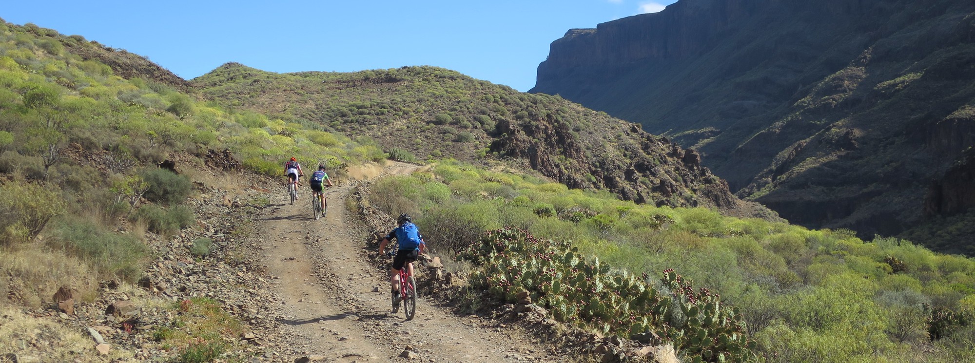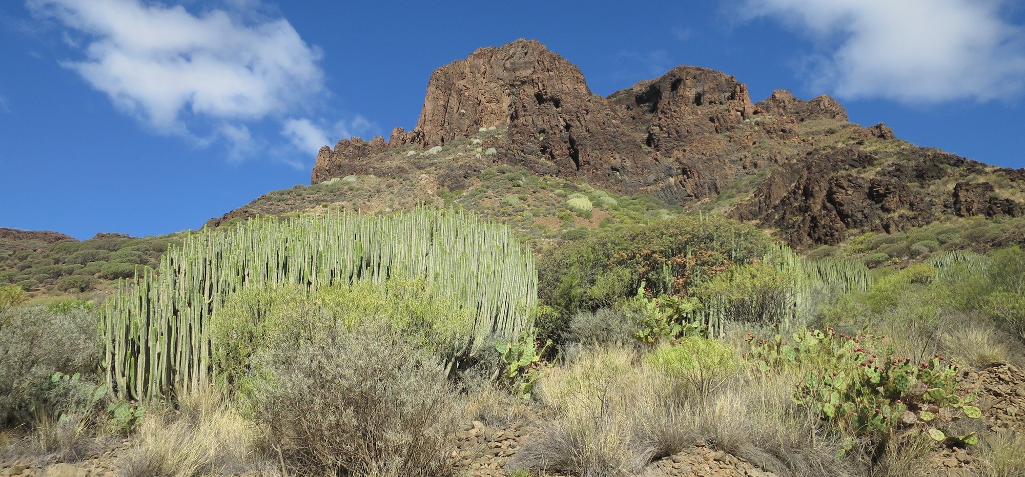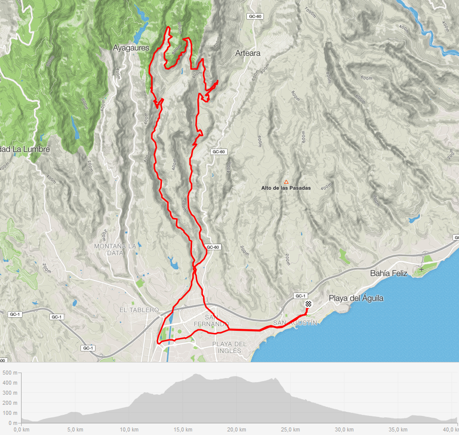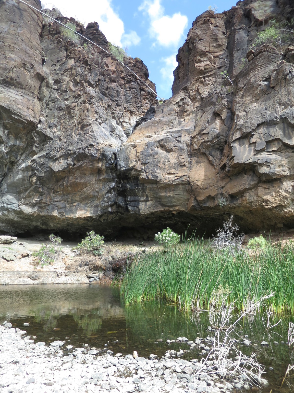 Ich fühlte mich etwas angeschlagen von den letzten Tagen und auch wenn es nur ein Gefühl war, ich wollte doch nicht riskieren mich hier mitten im Urlaub richtig zu erkälten, also bin ich heute eine entspannte Runde allein geradelt. Während die Jungs wieder hinauf nach Ayacata sind bin ich auf 1/3 der Höhe nach links abgebogen. Diesmal hatten wir den Schotterweg, auf dem wir gestern noch von der Straße aus Mountainbiker hinaufradeln sahen. Dieser stieg zunächst allmählig, später dann in Serpentinen auf eine Höhe von etwa 400 m über dem Meer. Hier trennten sich unsere Wege und ich fuhr die Schotterstraße weiter, die gen Stausee führte. Sie schlängelte sich an den Vulkanflanken und dessen Täler auf und ab. Manchmal dachte ich, nur noch um die Kurve und durch dieses Tal und dann beginnt da drüben ja schon die schöne Abfahrt. Aber Pustekuchen, ich bog um die nächste Kurve und erblickte einen erneuten Taleinschnitt, der zuvor nicht erkennbar war. An einem dieser Täler war ein kleiner aufgestauter See. Nach feuchteren Tagen und gut gefüllten Flüssen muss hier ein netter Wasserfall sein. Indess lockte mich das Gequarke der Frösche zu dem idyllischen Plätzchen wo ich mir ein kleines Mittagsstündchen gönnte – ganz die Dödeltour halt 🙂 . Danach nahm ich den letzten oder die letzten Anstiege in Angriff ehe ich den bekannten Weg hinab ins Flussbett und dann entlang des Flussbettes jagte. Hier ließ ich es nochmal laufen und machte ein wenig Tempo. Gegen Ende bemerkte ich dann, wie meine Schaltung sprang, ich konnte aber nicht erkennen dass was verbogen war. Am Ende des Weges hielt ich dann doch mal an und musste erkennen, dass wohl ein Stein meinen Schnellspanner löste und das Rad drohte heraus zu fallen. Außerdem verlor ich noch meine Sonnencreme – war wohl nicht ganz so ruhig die Abfahrt 😉 . Dann hieß es nur noch nach Hause rollen und nun sitze ich entspannt auf dem Balkon, während die Jungs noch auf die Heimkehr warten lassen. Vielleicht genießen sie auch einfach nur die Sonne in einem der zahlreichen Café’s. Morgen ist Ruhetag, wohl auch hier und Donnerstag schreiten wir dann zu neuen Taten.