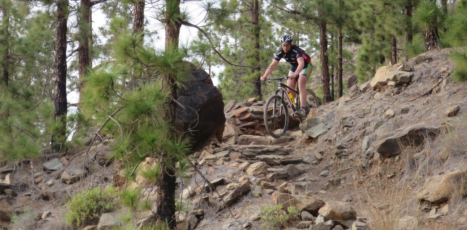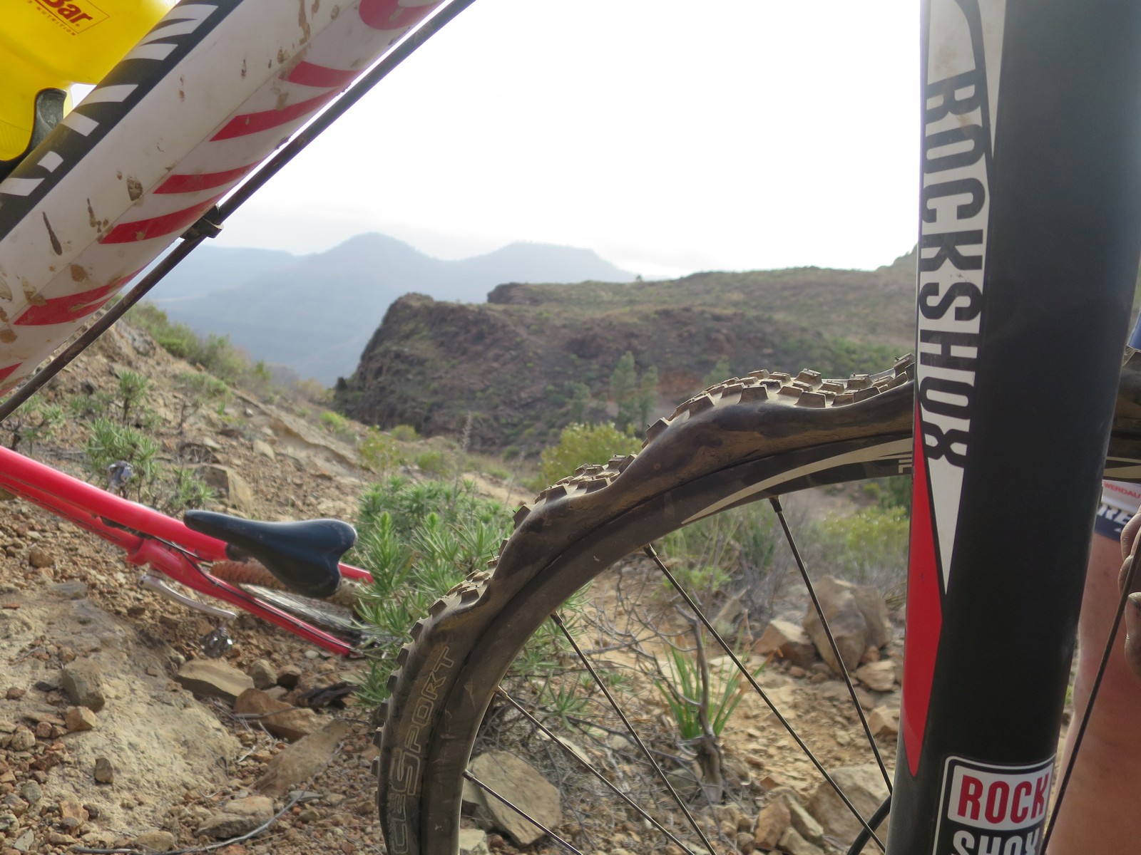 Somit ist der Tag eigentlich schnell erzählt. Bis Cruz Grande brachte uns der dänische Taxifahrer, selbst Mountainbiker. Von da an strampelten wir an Ayacata vorbei bis hin zu km 13 der der Straße Lugar Presa De Las Ninas, wo wir Benny aufgabelten. Dann ging es einige Kilometer und ein paar Höhenmeter auf abwechslungsreichem Schotterweg entlang, der uns durch wechselnde und teilweise leicht buschige Vegetation hinab bis El Juncal führte. Unterwegs gab es nochmal eine Kette zu flicken, diesmal mit Kettenschloss, das besser halten sollte. In El Juncal wurde beim Dorffest gefeiert, wir hingegen jagten wieder nach Ayacata hinauf. Die obligatorische Verpflegung im Cafe (Nudeln und Cola) gab uns nochmal ein wenig Kraft um noch die letzten Tiefenmeter zu nehmen. Hätte man vier müde Radler sehen wollen, man hätte nur nach Ayacata kommen müssen. Nach etwas Überredung bog auch ich in den letzten uns schon bekannten Trail ein – was waren wir müde in Körper und Geist. Im Trail lief es nochmal erstaunlich gut, abgesehen von einem Plattfuß von Harty. Vergessen die brennenden Arme und Hände, das Lächeln kehrte mit jeder bewältigten kniffligen Passage tiefer ins Gesicht. Es kam ein richtiger Fahrfluss auf, völlig entspannt im Kopf und so gelangen selbst einige der engeren Kurven. Damit hatten wir nochmal einen gelungenen Abschluss des Tages und der Woche. Am Stausee Ayagaures trafen wir wie verabredet wieder auf Benny, der nochmal extra Kilometer und Höhenmeter außenrum, abseits unserer Falllinie nahm. Und dann ging es im 4er-Mannschafts-Zeitfahren hinab nach Maspalomas – Benny war wohl auch endlich mal ein wenig kaputt gespielt, denn Harty und ich mussten regelmäßig mit in die Führung. Am kleinen Strand unterhalb vom Hotel gab es vom gefundenen Zwanziger noch ein Eis. Ein schöner Tag und ein schönes Finale. Mensch und Technik haben mehr oder minder gehalten, ich für mich blicke auf eine völlig defektfreie Woche zurück. Die Handy-Halterung ist der Hammer, hat die tollsten Rüttelpassagen bestens gehalten. Es waren herrliche Tage, aber nun reichts auch erstmal mit dem so intensiven Radeln.