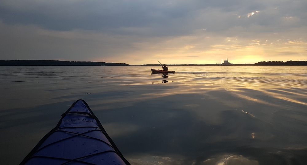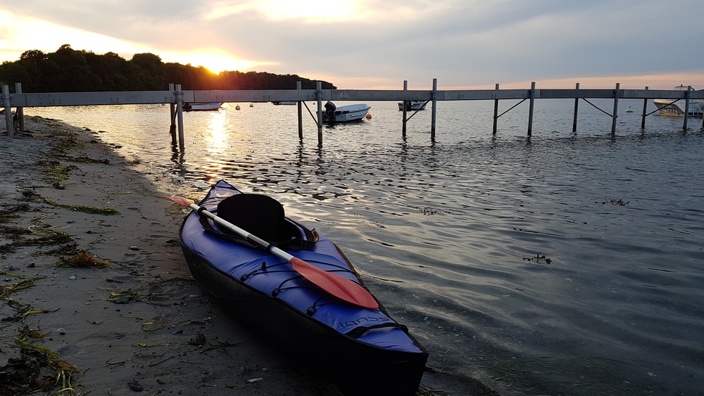 Abends bauten wir unsere Kajaks auf, was schon deutlich schneller ging als beim ersten Aufbauversuch im Trockenen zu Hause. Kaum im Wasser hörten wir es schnaufen. Wenig später erspähten wir die Schweinswale. Nur eine kurze Strecke führte uns im Sonnenuntergang an die unserem Zeltplatz gegenüberliegende Küste der Insel Faenö.