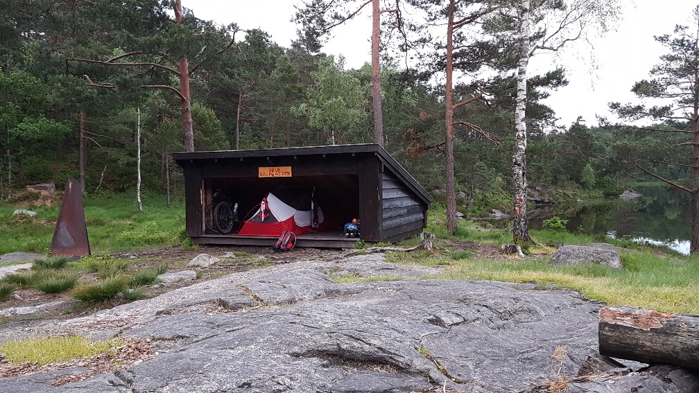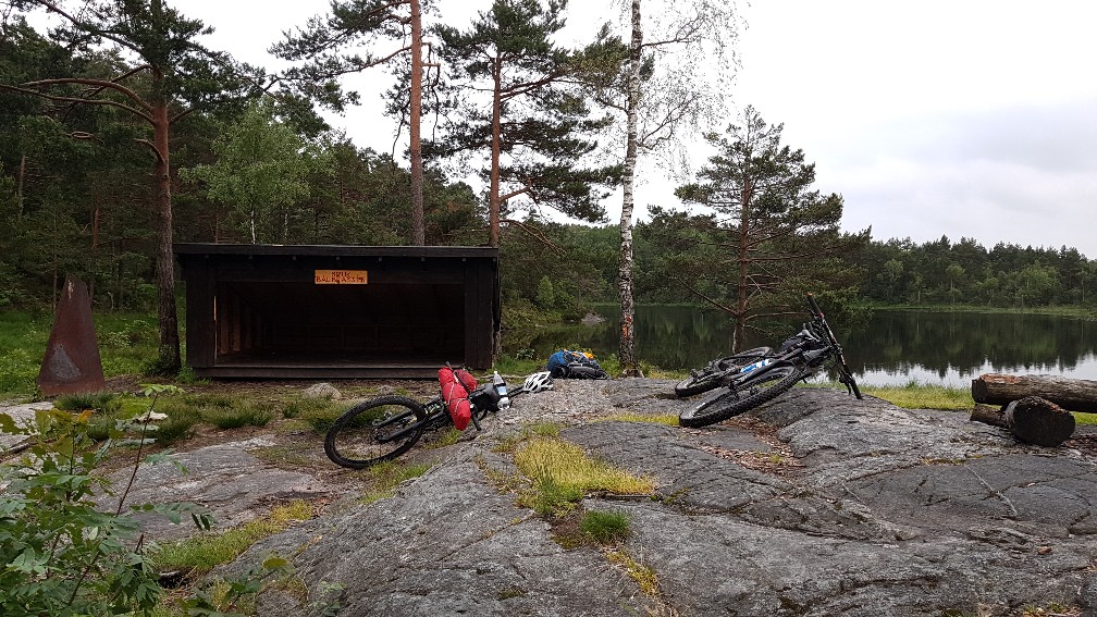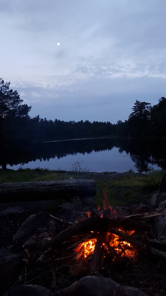 Nach gut zwei Stunden Fährfahrt und einem kleinen Abendessen an Bord plünderten wir noch einen Supermarkt und radelten zielstrebig ins Fjell, nagut, ins Stadtfjell. Irgendwie fühlte es sich ein wenig schade an, dass wir links und rechts die Trails liegen ließen und so kam es uns ganz gelegen, als wir nach nur 7 km schon einen ideales Nachtlager fanden. Nun läuft das Feuer und ab und an luschert der Mond aus den Wolken hervor.