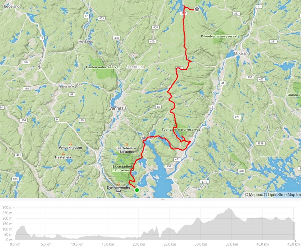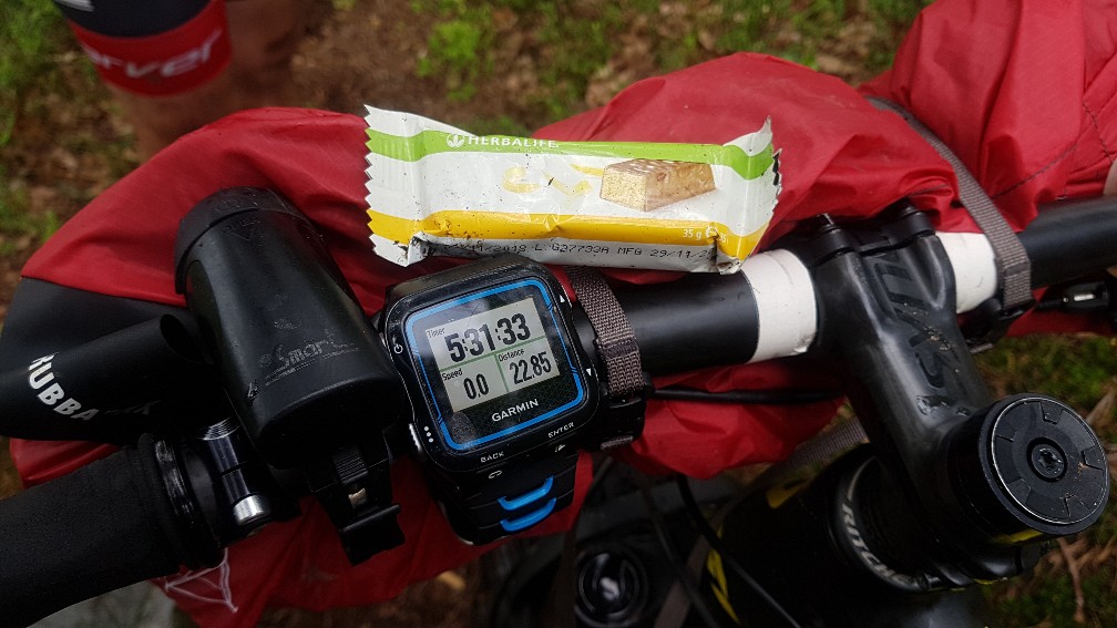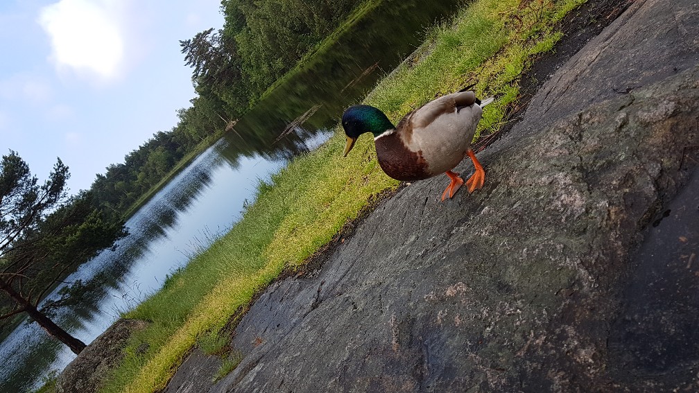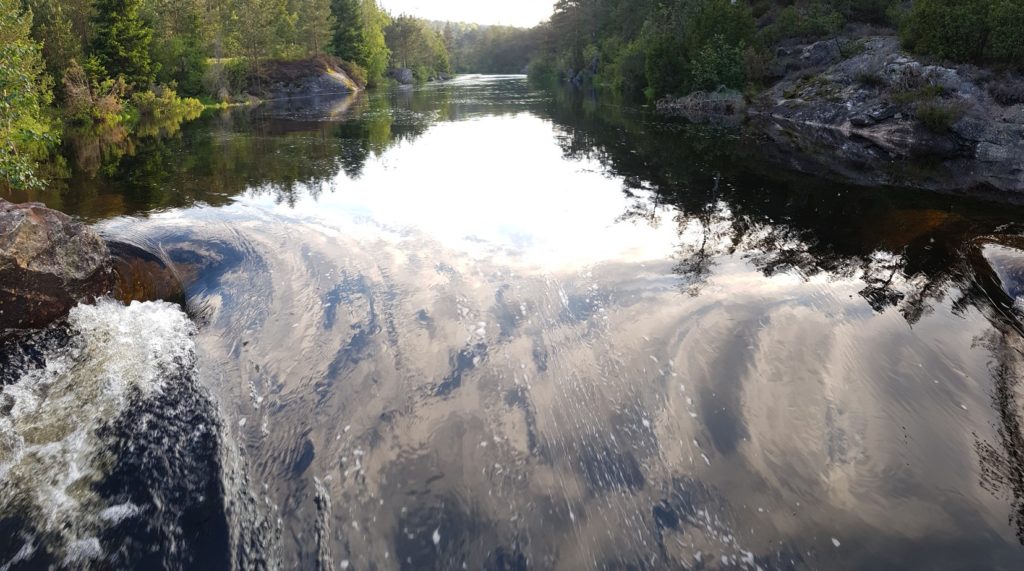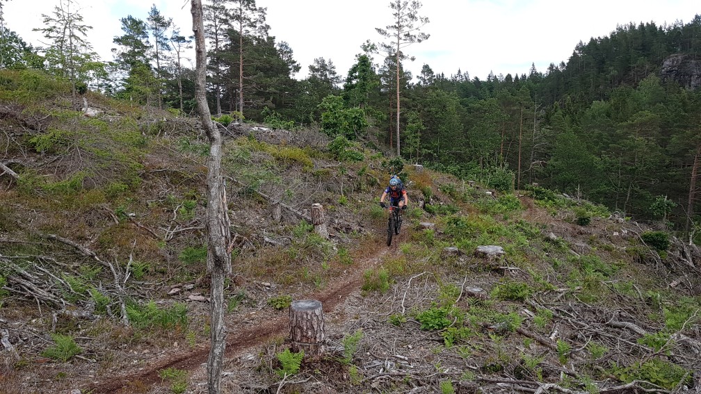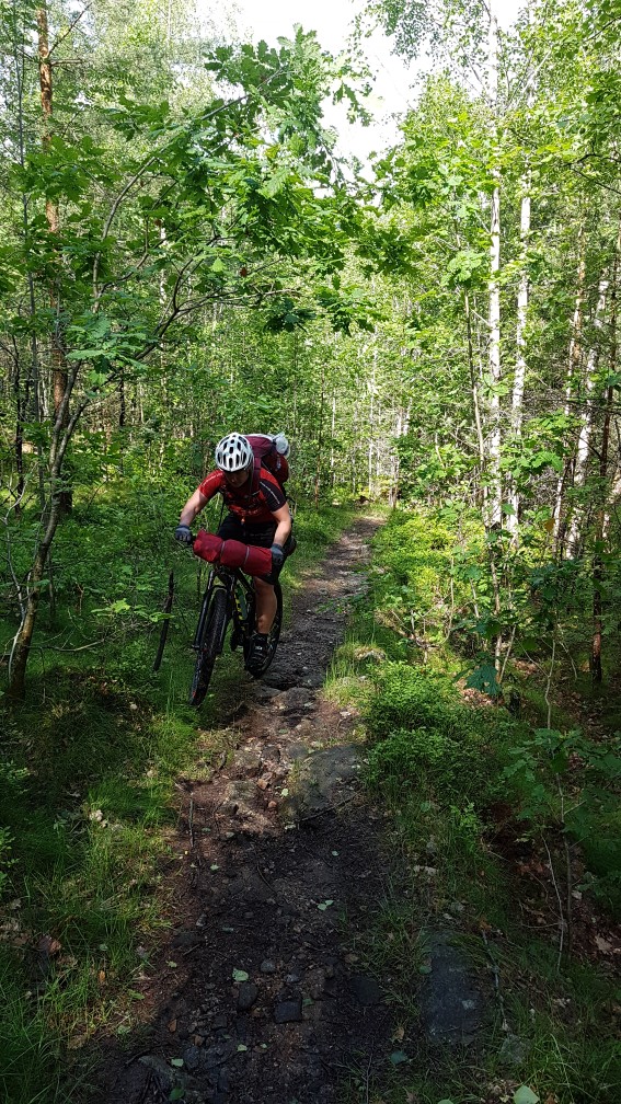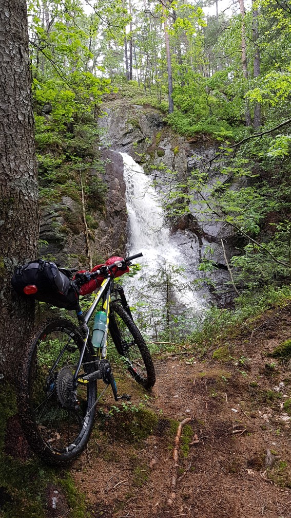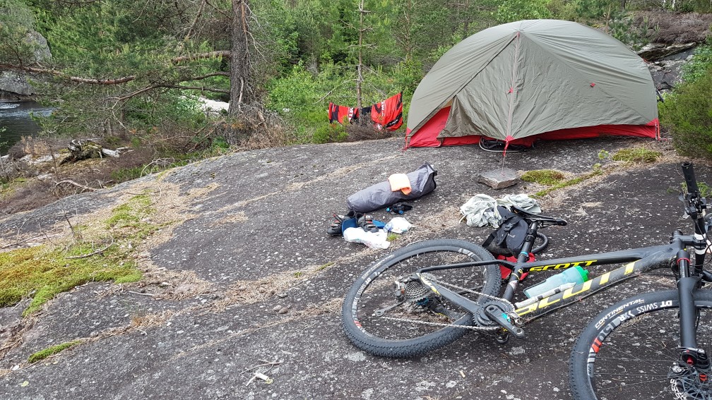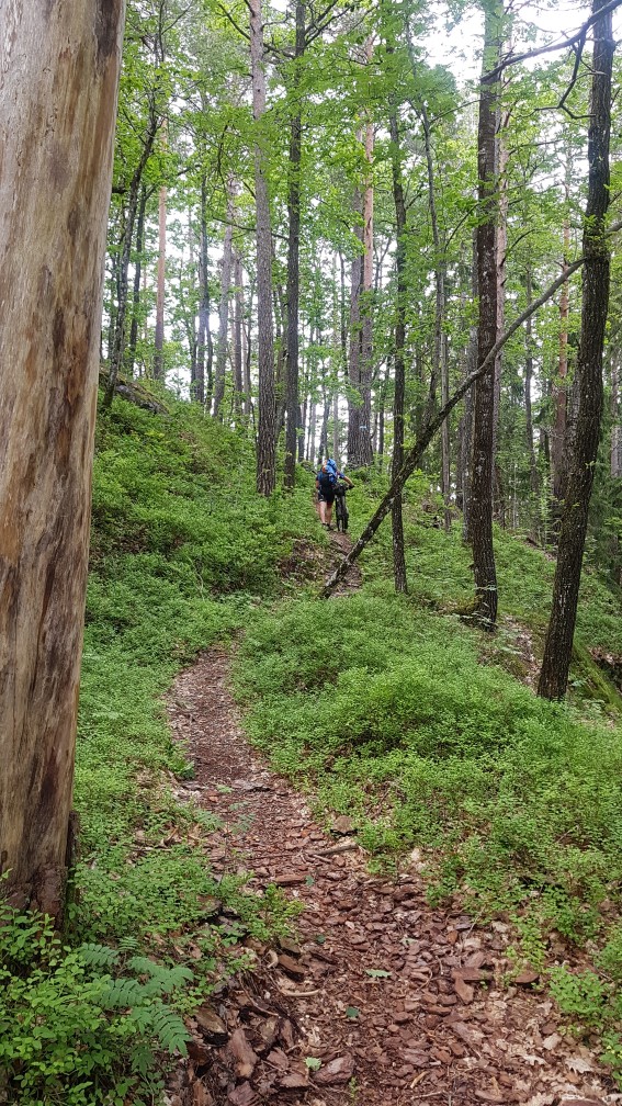 Für neuen Proviant fuhren wir zum nächsten Supermarkt ins gut 5 km entfernte Krageboen. Dafür startete dort in der Nähe ein nochmals interessant ausschauender Wanderweg der teilweise für das MTB mit Schwierigkeitsgrad Blau einkategorisiert wurde, also für uns überwiegend gut fahrbar mit technische Finessen. Der erste Teil war dann auch so und man sah, dass hier Mountainbiker unterwegs sind, doch irgendwann bog der gute Weg unmarkiert ab und wenig später mussten wir durch morastige Gebiete schieben oder über Steine und Bäume klettern. Mühseelig und wir kamen nur langsam voran. In einem kleinen Sackgassenweg fand ich einen Energieriegel und wir freuten uns schon auf den kleinen Snack, doch beim Auspacken sah er weder gut aus noch roch er apetitlich, er war doch erst 12/2018 abgelaufen. Also übergaben wir ihn der Natur und steckten die Hülle für den nächsten Mülleimer ein. Die letzten Kilometer zum See erradelten wir über Straßen, es gab jedoch auch kaum Alternativen.