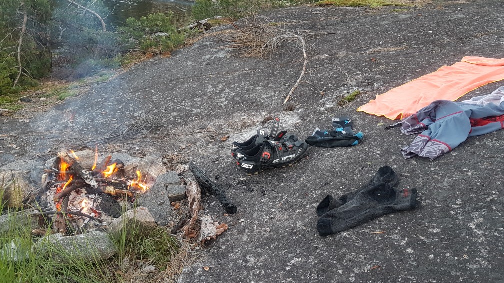 Das Zelt steht nun auf einer Felsplatte und Schuhe und Sachen wurden am Feuerchen getrocknet.