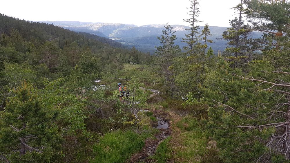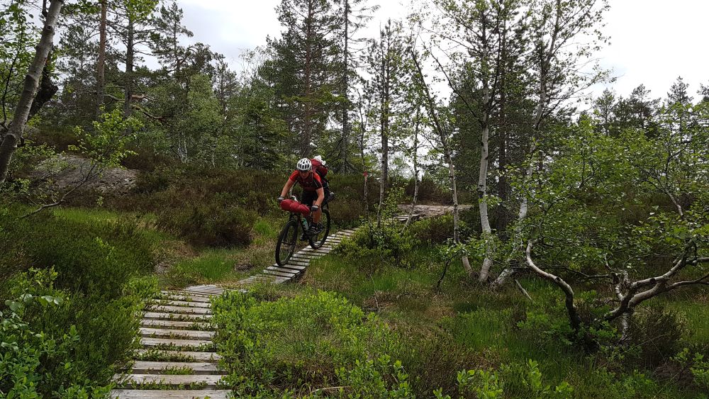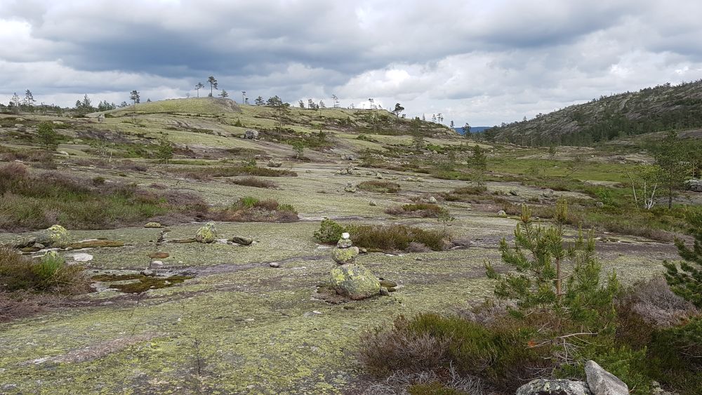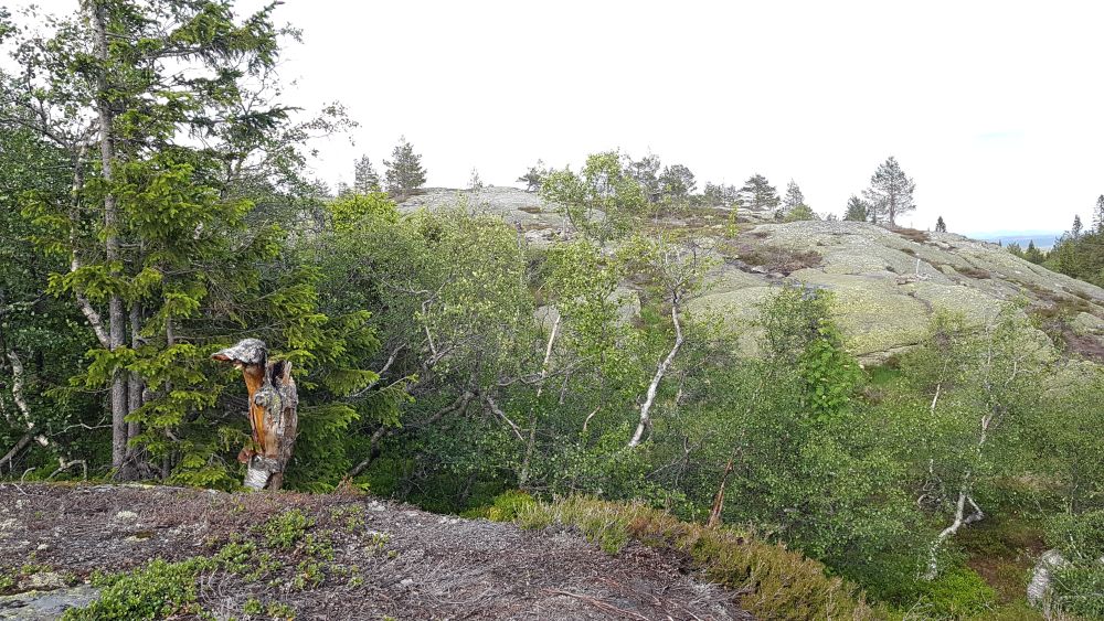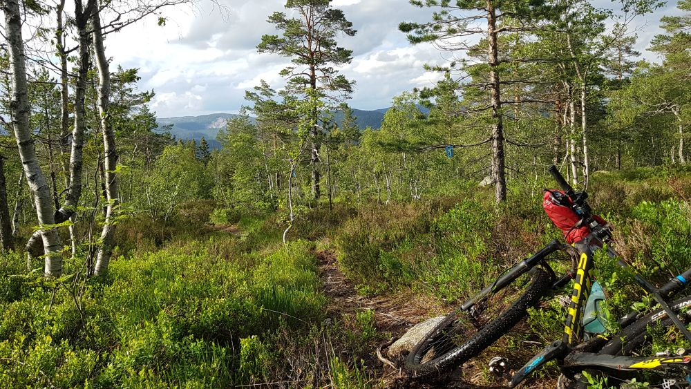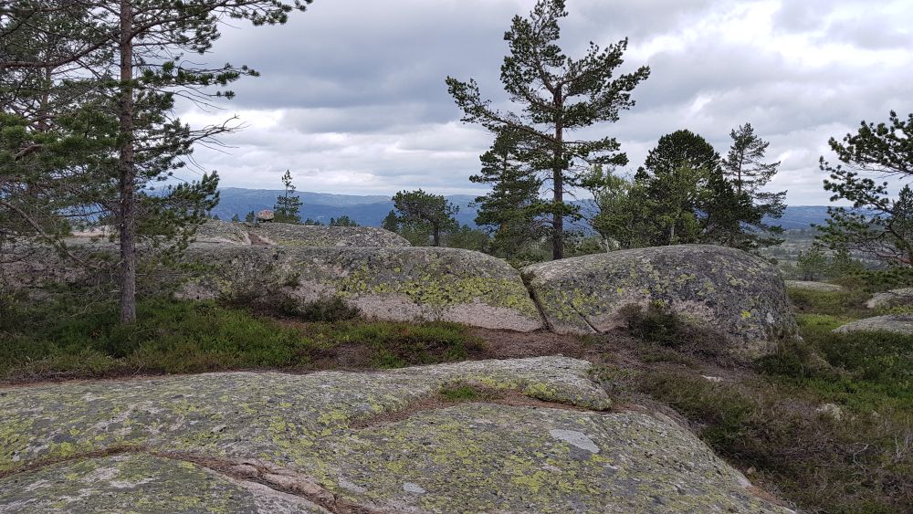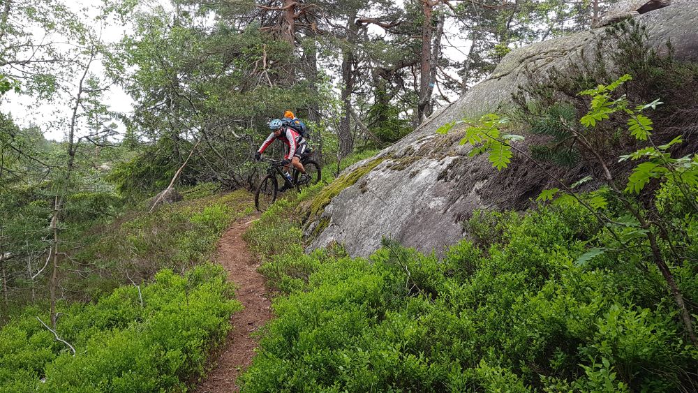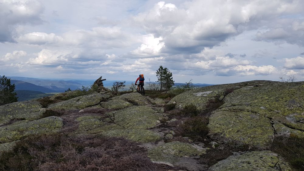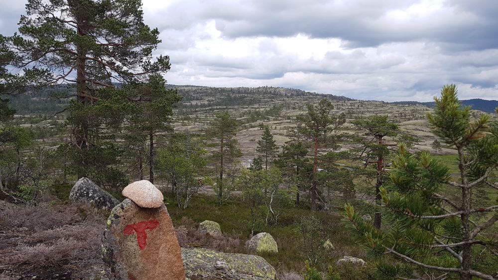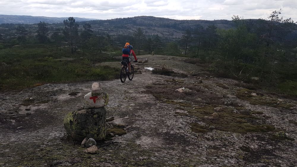 Uns wäre auch wirklich was entgangen, es gab noch einige knifflige Passagen, an denen wir schieben mussten und das Gelände war deutlich nasser. Mit der Bergkuppe und einer Steinpyramide erreichten wir mit 675 m unseren höchsten Punkt der gesamten Tage. Wir folgten den zwei Wanderwegen, die immer besser befahrbar wurden hinab. Es wurde trockener und die Vegetation verdichtete sich rasant und wurde grüner. In einer kleinen Pause an einem mit Schild benannten Stein genehmigte ich mir die letzten Häppchen Schoki mit Karamel-Füllung für eine bessere Konzentration. Im Rest der Abfahrt ließ ich es dann nochmal richtig laufen und gerade als ich mich ein wenig zügeln wollte um keine Sturz zu riskieren blieb auch schon mein Vorderrad an einer Wurzel stecken. Naja, an den Blaubeersträuchern hingen noch immer keine Beeren, also rappelte ich mich wieder auf und setzte die Fahrt unbeschadet in den Nadelsaum-Trails fort, bis wir in Kittilsbu östlich von Gautefall auf die Straße entlassen wurden.