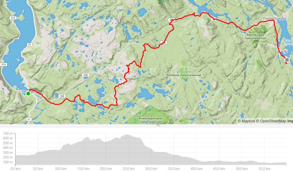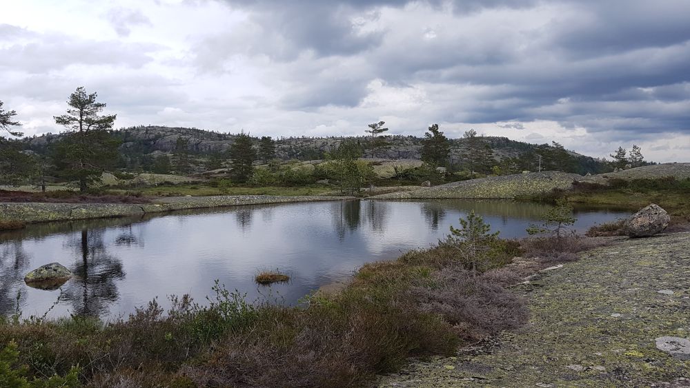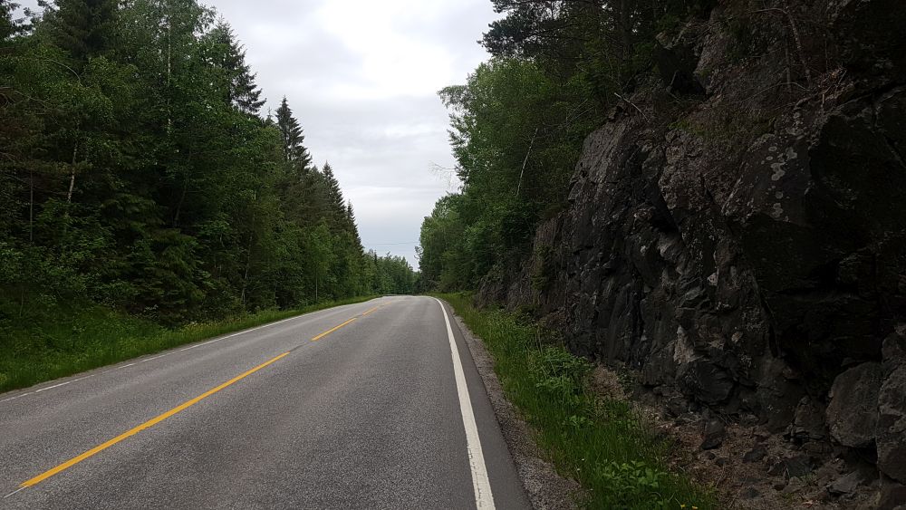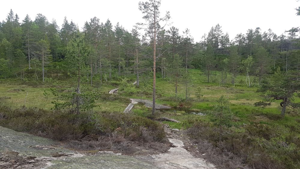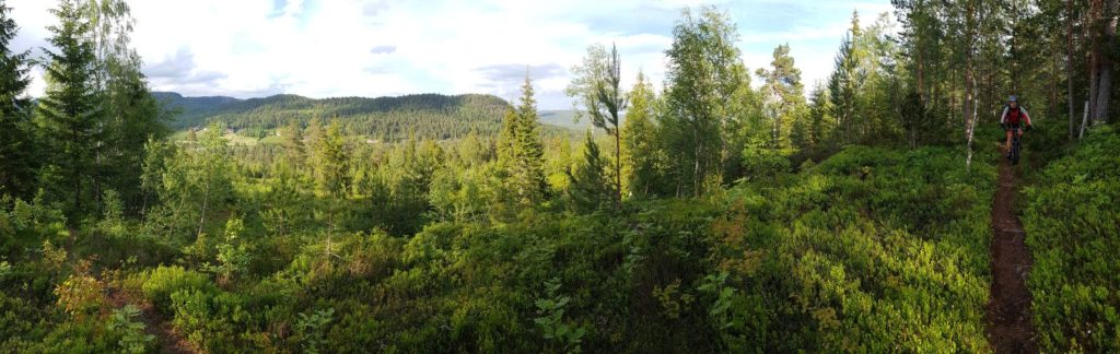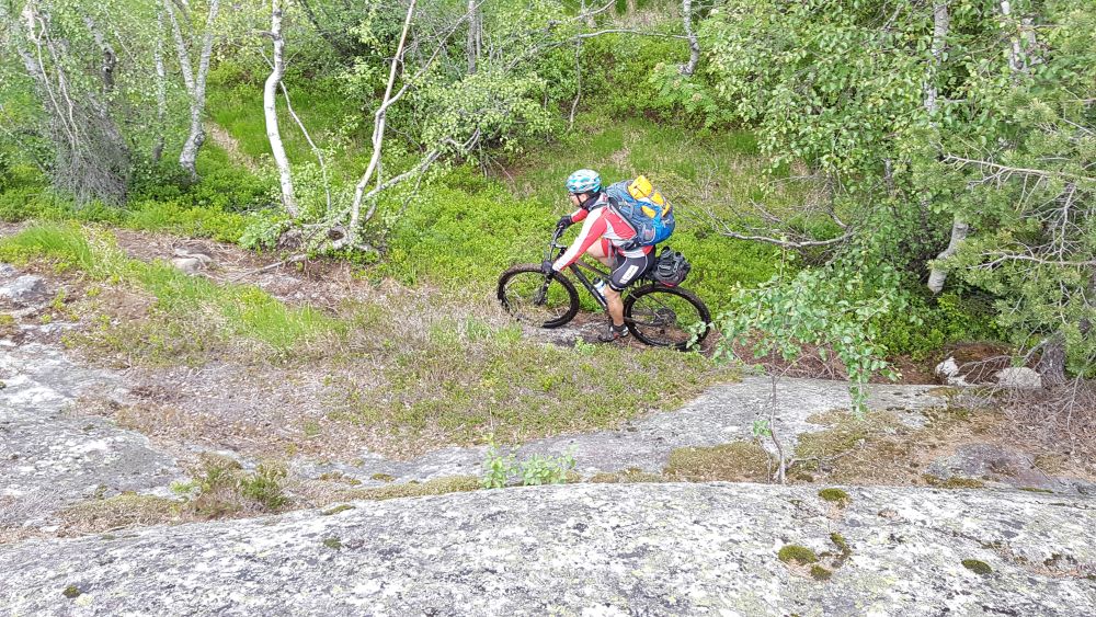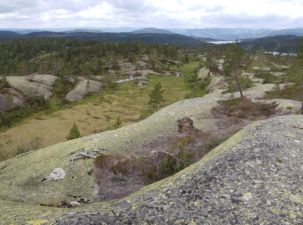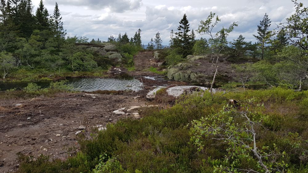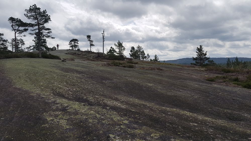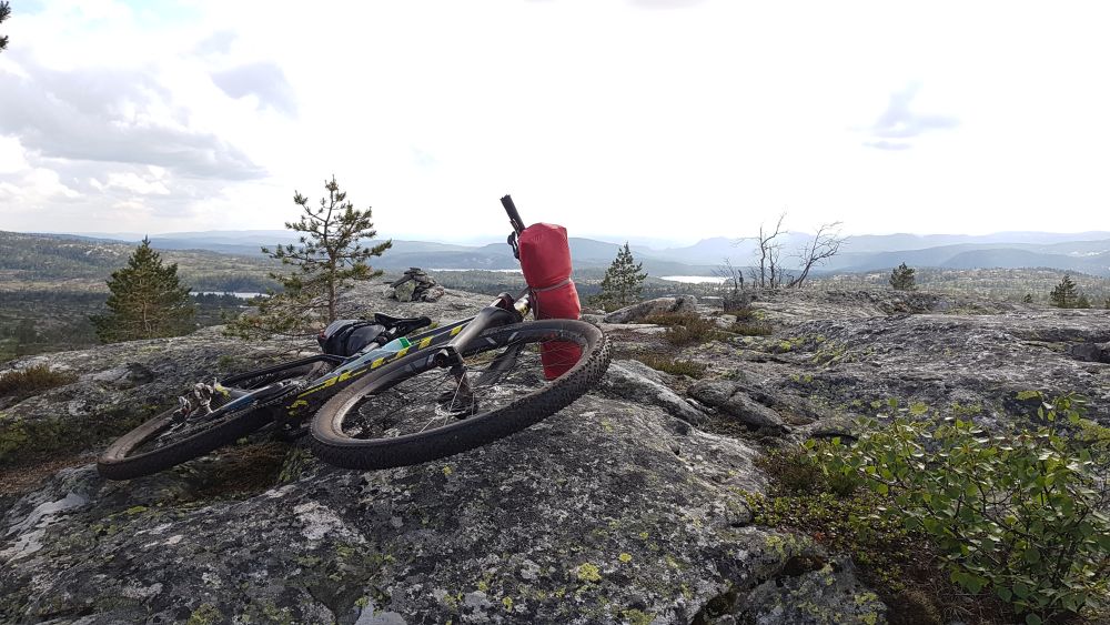 Uns wäre auch wirklich was entgangen, es gab noch einige knifflige Passagen, an denen wir schieben mussten und das Gelände war deutlich nasser. Mit der Bergkuppe und einer Steinpyramide erreichten wir mit 675 m unseren höchsten Punkt der gesamten Tage. Wir folgten den zwei Wanderwegen, die immer besser befahrbar wurden hinab. Es wurde trockener und die Vegetation verdichtete sich rasant und wurde grüner. In einer kleinen Pause an einem mit Schild benannten Stein genehmigte ich mir die letzten Häppchen Schoki mit Karamel-Füllung für eine bessere Konzentration. Im Rest der Abfahrt ließ ich es dann nochmal richtig laufen und gerade als ich mich ein wenig zügeln wollte um keine Sturz zu riskieren blieb auch schon mein Vorderrad an einer Wurzel stecken. Naja, an den Blaubeersträuchern hingen noch immer keine Beeren, also rappelte ich mich wieder auf und setzte die Fahrt unbeschadet in den Nadelsaum-Trails fort, bis wir in Kittilsbu östlich von Gautefall auf die Straße entlassen wurden.
