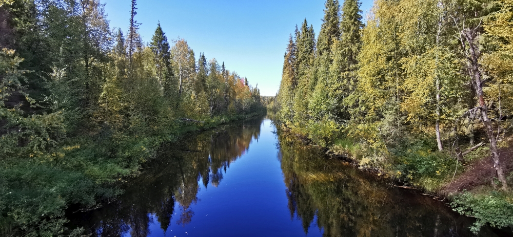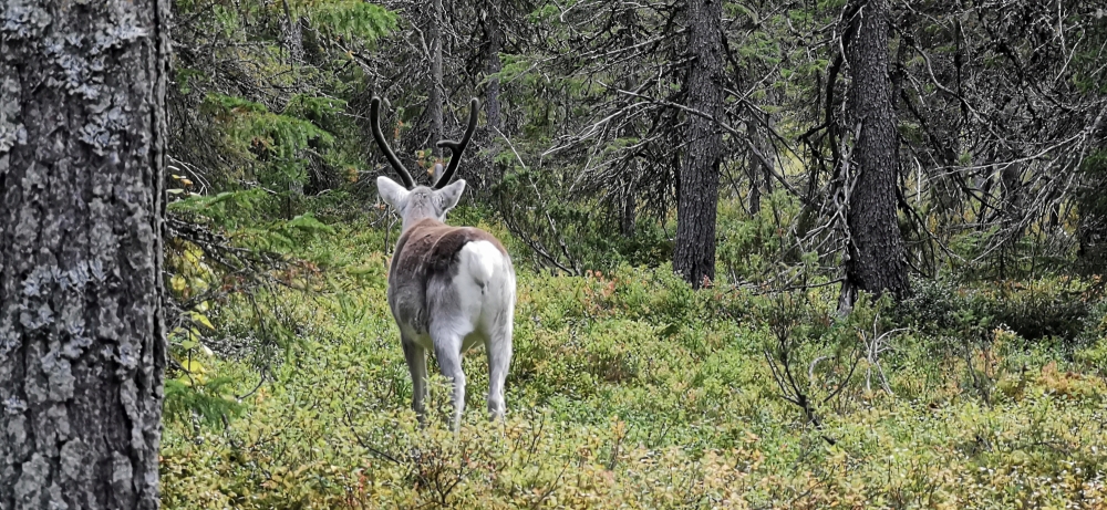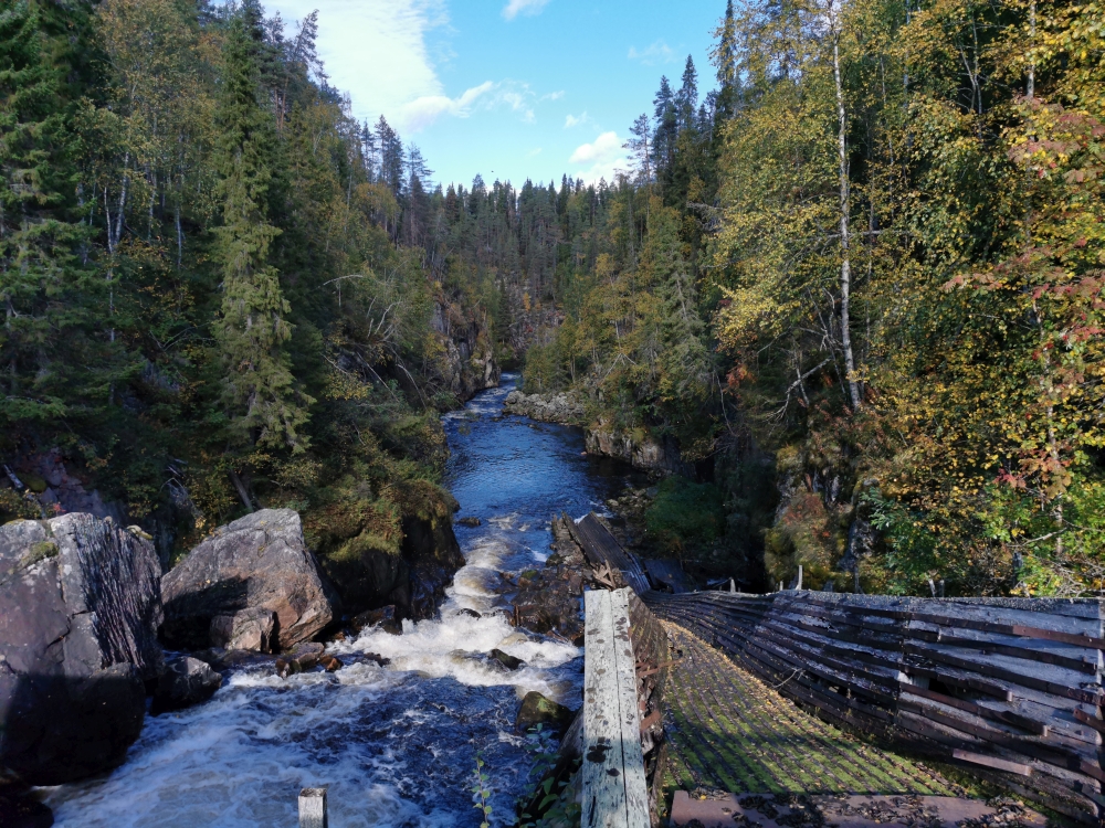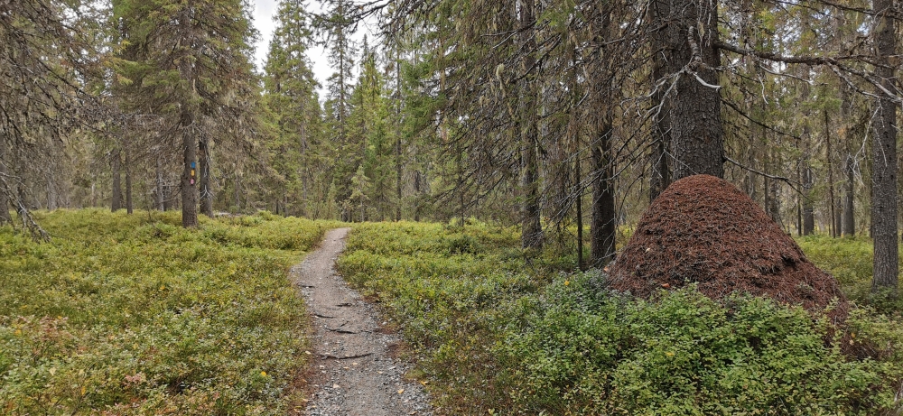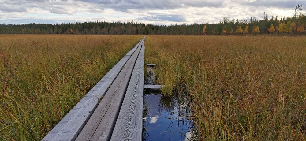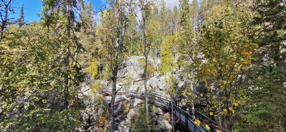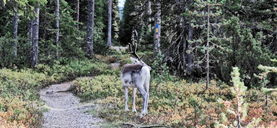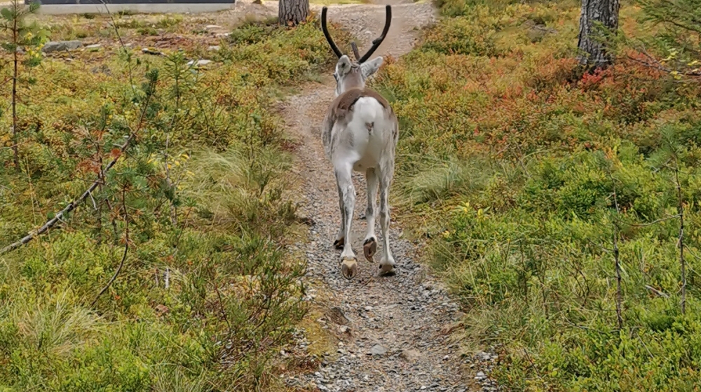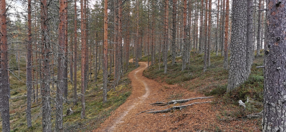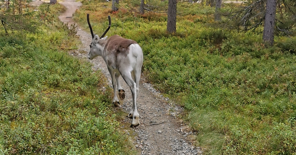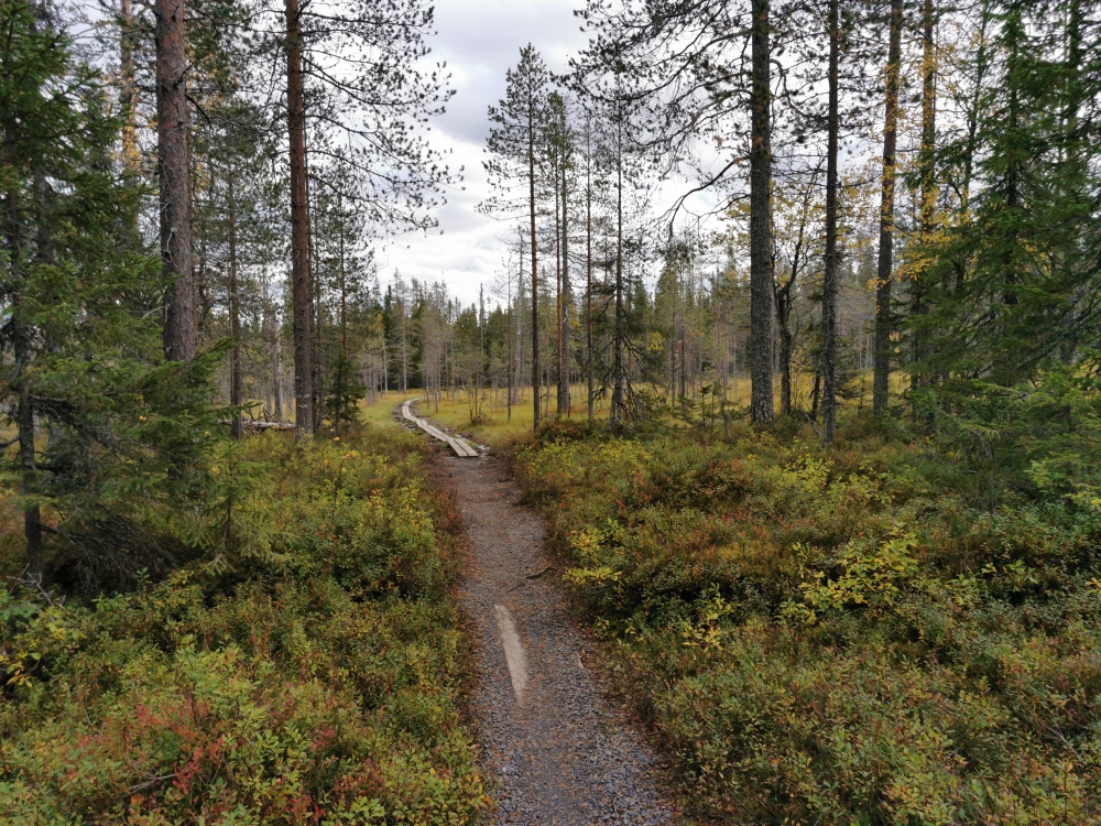 Eine kleine entspannte Kajak-Tour zum Sonnenaufgang.Das obligatorische Zeltplatzfoto diesmal vom Wasser aus. Ein kleiner Wasserfall mit Bootsrutsche. Ein schön ausgebauter Wanderweg. Hier waren echte Hundeliebhaber am Werk, denn alle Metallbrücken und Treppen wo es ging hatten zwei Holzlatten für die Hundefüße montiert.Blick von einer Hängebrücke auf den nun wieder ruhigen Fluss.Besagte Hängebrücke und an den Treppen am linken Rand sieht man die Holztritte für die Hunde.Ein kleiner Aussichtsturm um auf die Wälder der Gegend blicken zu können.Wald, so weit das Auge blicken kann. Gigantisch!!MTB-Pfade, samt Ameisenhügel in Syöte.Na und Blaubeeren gibt es auch hier rechts und links des Weges.Nicht zu schweigen von den Rentieren.Putzig diese Tiere. Und wer nen Weihnachtswunsch hat, ich glaube es gibt genug Rentiere in Lappland um die Geschenke in die Ganze weite Welt auszutragen.Wie schon gesagt, ich kann mich nicht satt sehen 🙂 . Am Baum ist die Markierung für die verschiedenen MTB-Runden zu sehen (blau, gelb, rosa).… ok, das war immer das selbe Tier.Ein endlos scheinender Bretterweg durch ein endlos scheinendes Moor. Das Moor ging nach links hin so weit das Auge blicken konnte.Fast auf der ganzen Runde zog sich solch ein flowiger Trail entlang. Es waren vor allem E-Biker unterwegs und einige mit Fatbikes, natürlich mit E-Unterstützung.