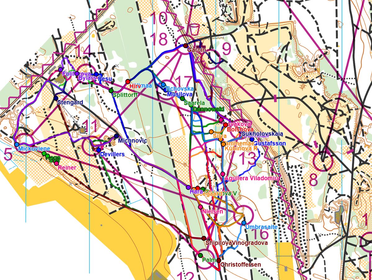Die Langstrecke verlief noch richtig gut für mich. Die Beine waren frisch, die Konzentration war gut und so unterliefen mir nur wenige Fehler obwohl es Stellenweise echt viele Posten gab. Gleich die Routenwahl zum zweiten Posten war sehr knifflig und schlussendlich entschied ich mich zwar vielleicht nicht für die schnellste Route, aber eine sicherere. Und der Zeitverlust war nicht so riesig. Das ganze Rennen war angesagt das Tempo hoch zu halten. Das gelang recht gut und machte richtig Spaß und ich hatte einen guten Rennfluss.. Erst im letzten Renndrittel wurde ich von der nach mir gestarteten Finnin eingeholt und so fuhren wir den Rest des Rennens größtenteils zusammen, nahmen nur wenige Kleinrouten unterschiedlich. Wobei zusammen so eine Sache ist, denn ich hatte teilweise zu tun wieder an ihr Hinterrad zu gelangen, wenn meine Micro-Routenwahl etwas schlechter war. Schlussendlich fuhr ich auf einen zufriedenstellenden 14. Platz ein und konnte damit meine zweit Top15 bei der diesjährigen WM einfahren. Schöne Ergebnisse die eine gute Saisonvorbereitung im Winter widerspiegelten und auch Resultat waren, dass ich schon Ende Mai Luft in den finnischen Wäldern schnuppern konnte.