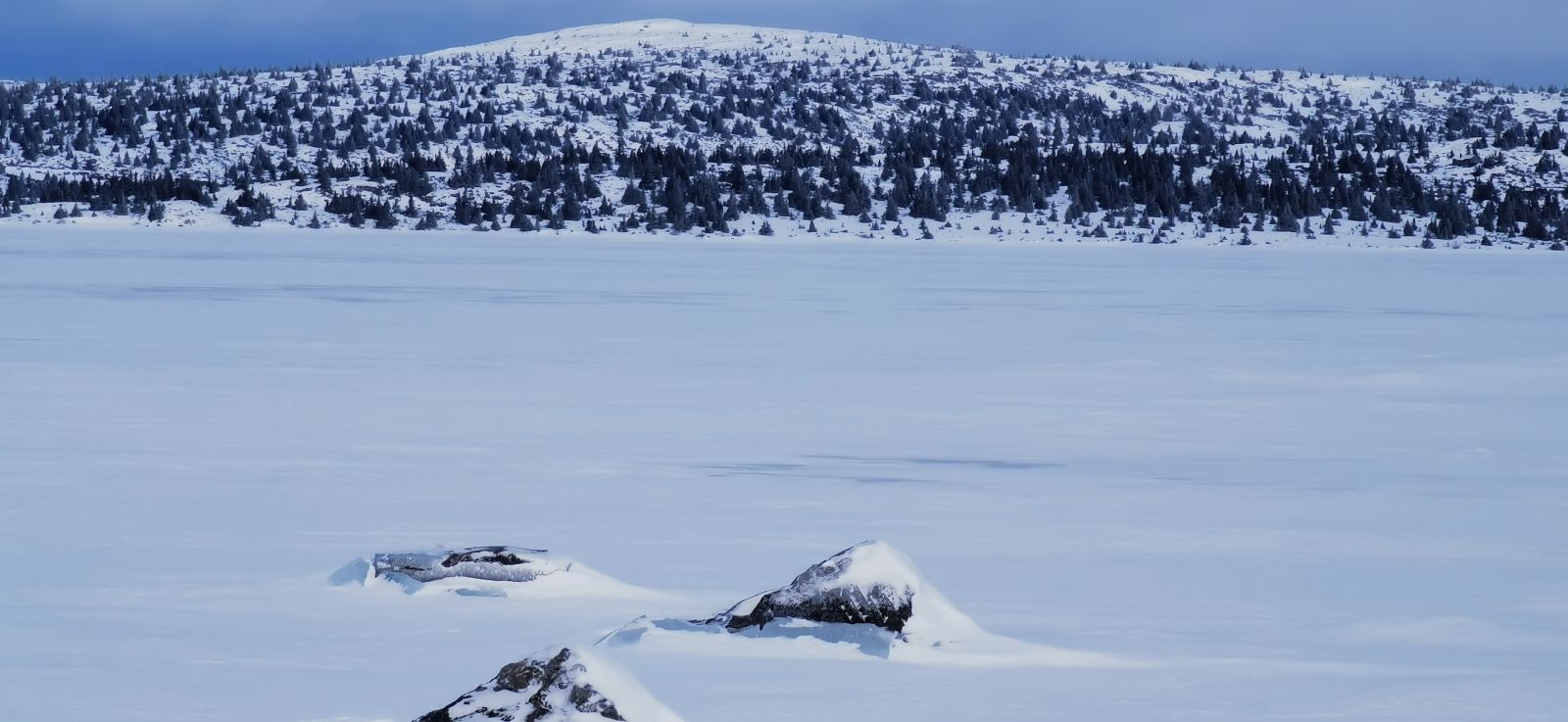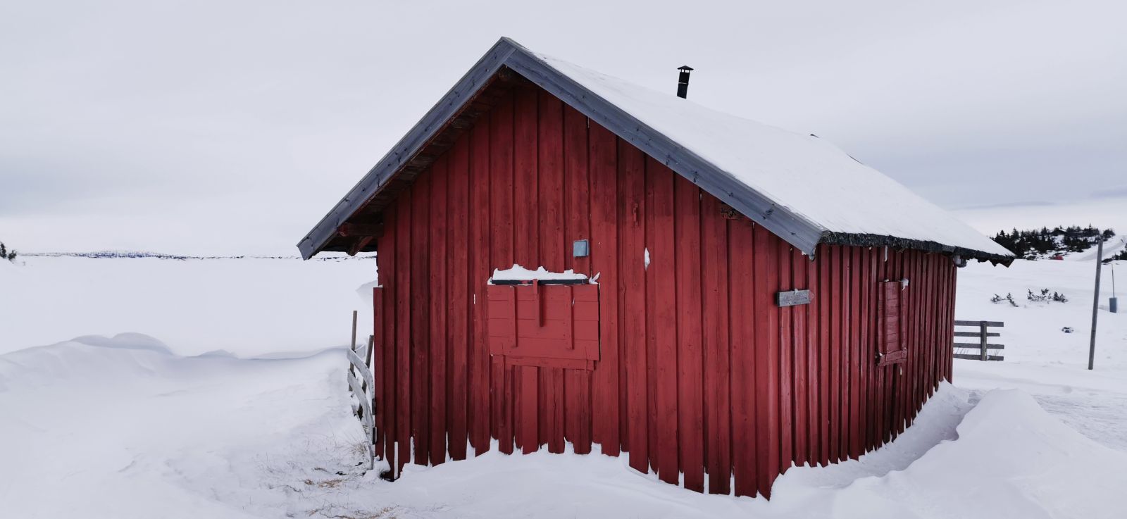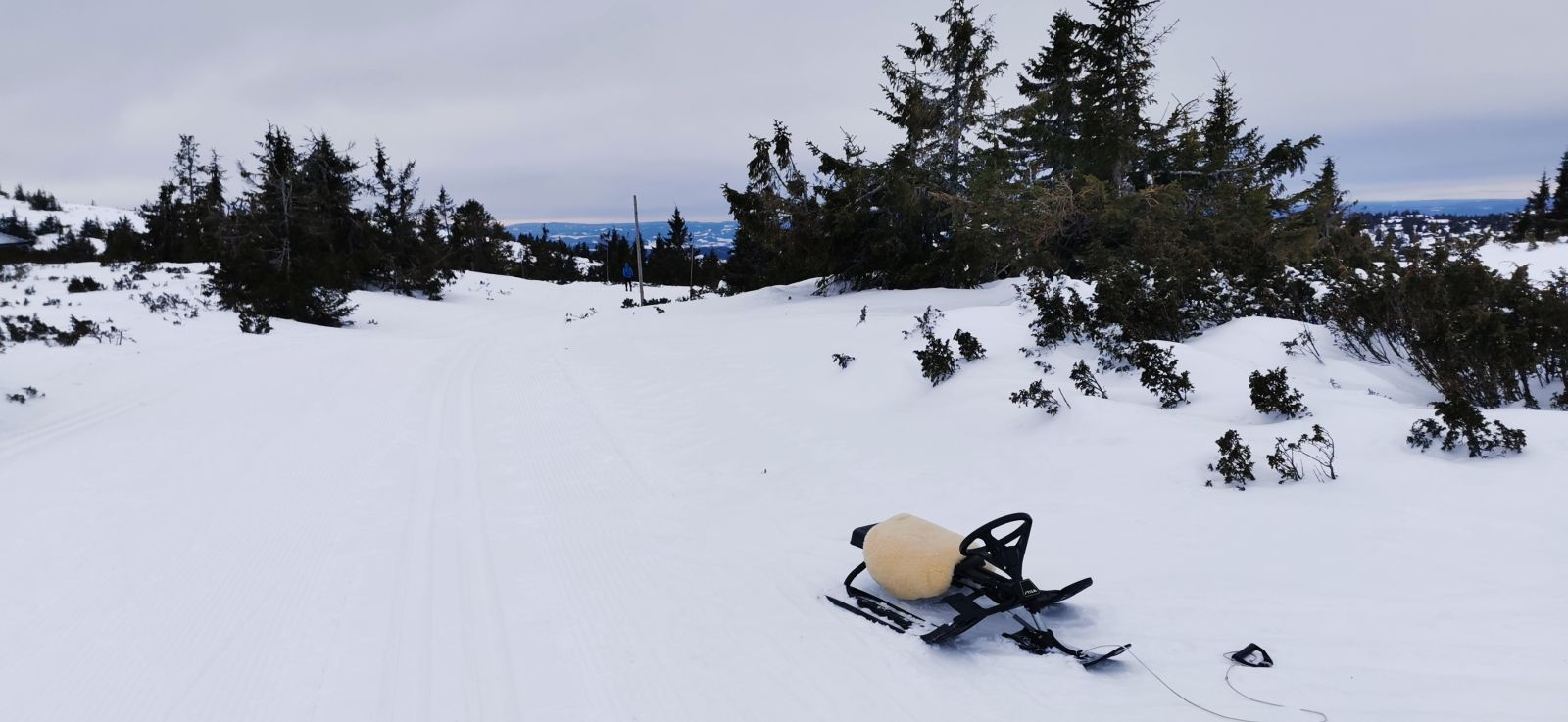 Unsere Wachshütte auf dem Übernachtungsgelände.Das Nevelfjell (1090 m) immer fest im Blick. Nur ganz wenige sind vor uns auf der frisch präparierten Loipe unterwegs.Schneeverwehungen, hauptsächlich vom Vortag.Loipe durch Kuaasen – nur gut 3 Stunden zuvor frisch gespurt.Ulf in der Abfahrt hinab vom Gjestbodsaasen. Im hintergrund sieht man noch die Kante zum schönen Wetter (blauer Streifen), die sich immer mehr von uns entfernte.Für die Abfahrt auf die Hochebene hätte uns sogar auch ein Schlitten zur Verfügung gestanden. Zuvor mussten wir einige unerwartete Höhenmeter absolvieren, die aber trotz Müdigkeit noch viel Spaß gemacht haben. Und wenn es rauf geht, geht es ja auch irgendwann wieder runter.