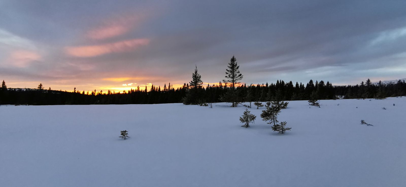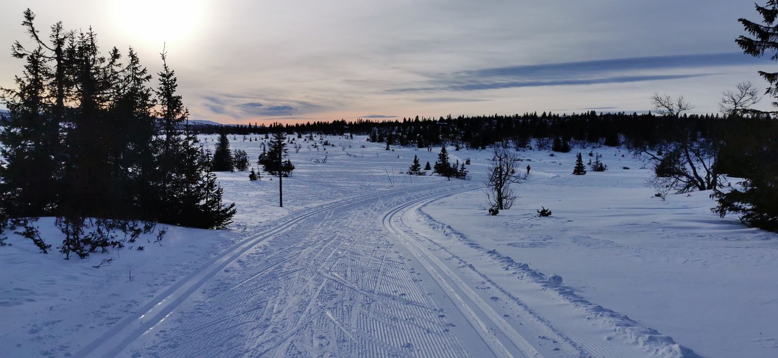 Ein nebliger Start und gerade als wir in die Ski schlüpften kam der Loipenbully und präparierte für uns die Loipe. Den ersten Kilometer geht es nur bergauf, da kann man schonmal ins Schwitzen geraten.Oben auf dem Fjell angekommen riss der Himmel auf und für ein paar Sekunden zeigte sich sogar die Sonne.Eine einfach beeindruckend schöne Winterlandschaft.Eine einfach beeindruckend schöne Winterlandschaft.Ulf in der Abfahrt auf der Loipe ins Knidalen (Knital).Glück gehabt, ein Loipenbully kreuzte meinen Weg und noch viel besser es fuhr von da an mir Vorraus. Zum Glück, denn der Wind machte den Loipen doch etwas zu schaffen und über Nacht war ja auch etwas Schnee gefallen.Frisch geloipt ging es also guten Schrittes nach Pellestova, wo wir uns wieder eine Waffel gönnten.Das zugefrohrene Reinsvatnet. Das Eis schiebt sich am Rand und an Steinen auf. Im Hintergrund ist das Reinsfjellet zu sehen.Der Wind war so stark, dass die frischen Skispuren innerhalb einer Minute teilweise wieder verschwanden.Zum Abend gab es den fast obligatorischen Sonnenuntergang der die Landschaft in ein sanftes rosa-orange legte.Auf dem Rückweg nach Hause, als wir den letzten Posten des Tages eingesammelt hatten.
