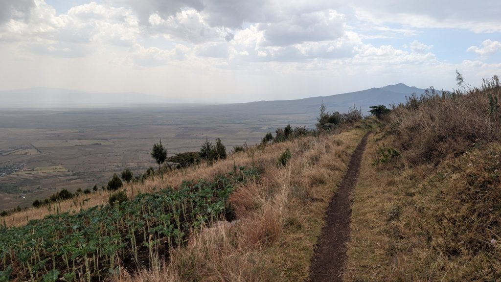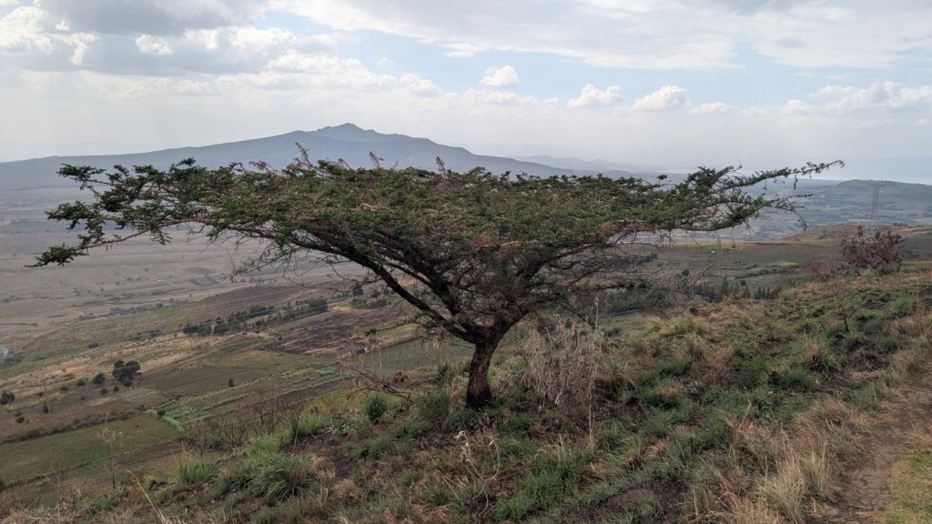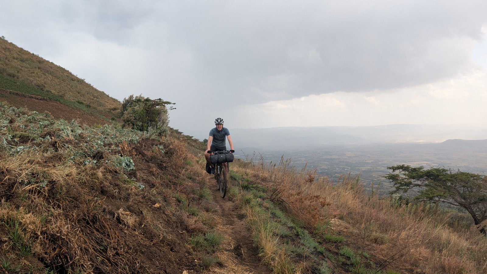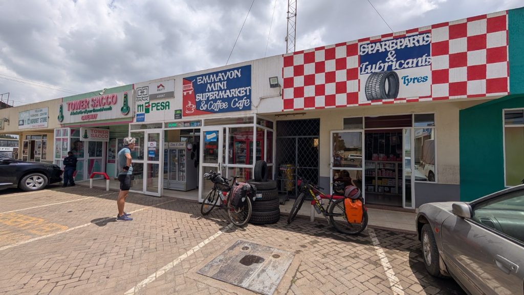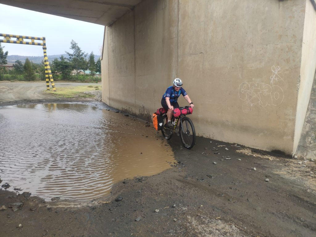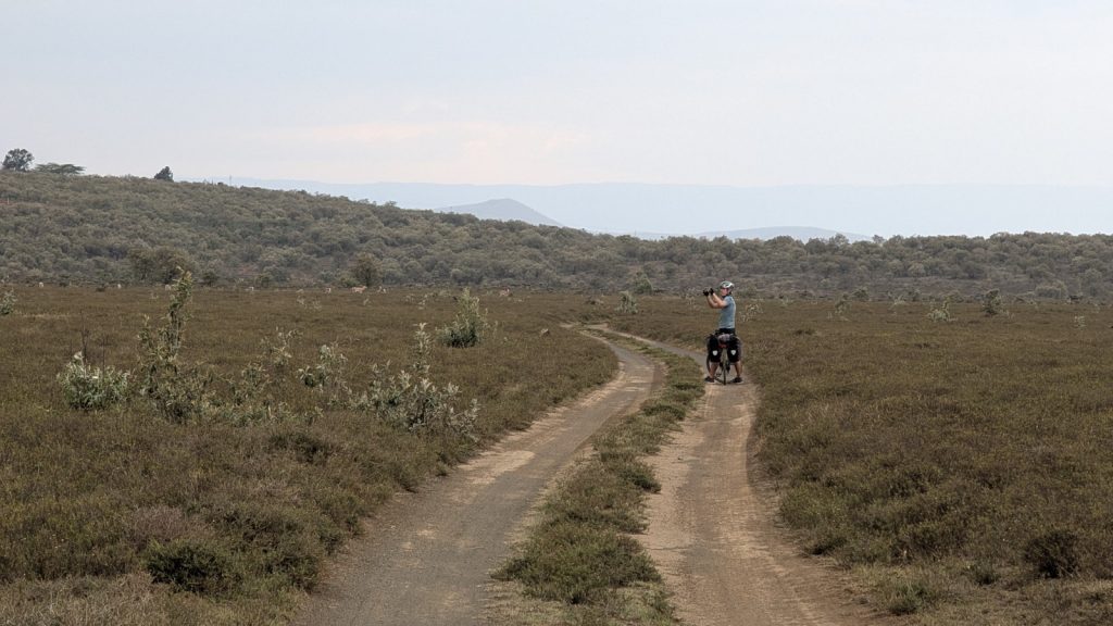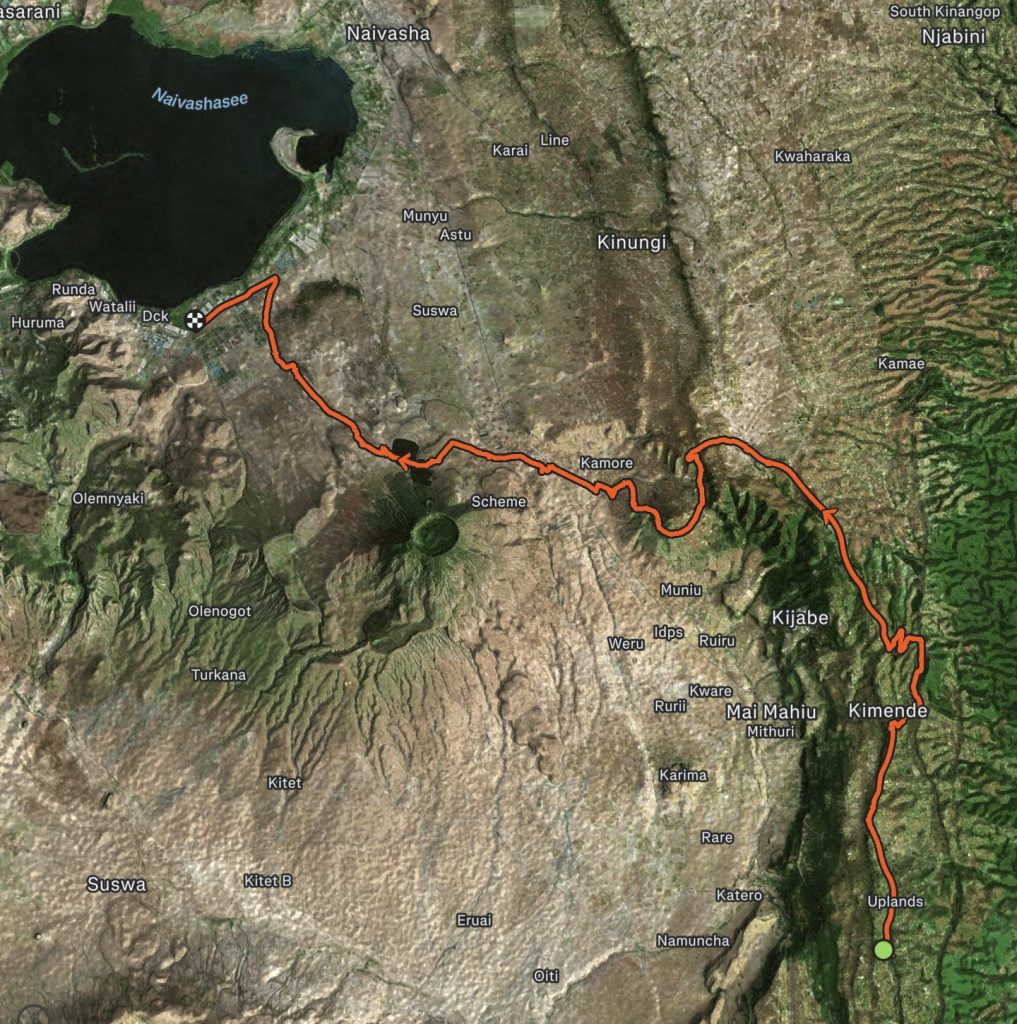 Schlussenddlich bogen wir an der Flyover Bridge der A104 ins Gelände ein. Zuvor stärkten wir uns allerdings im Imbis an einer Tankstelle mit Samosa und Pizza. In der folgenden Abfahrt sammelte Daniel ein paar herumliegendeä Kartoffeln auf und nur wenig später holte uns der bereits drohende Regen ein, den wir unter einem Busch aussaßen. Der Regen ließ langsam nach und so schlängelten wir uns über mehr oder weniger holprige Straßen an den Rand eines Vulkancraters. Entlang der Vulkanflanke führte ein schöner Singletrack. In der folgenden Abfahrt überholten wir einen LKW der sich mühevoll von Loch zu Loch schlich. Vorbei an Longonot führte uns der Weg durch die Kedong Range. Wir erblickten unsere ersten Garzellen, einen Büffel und Zebras, allerdings waren sie ja auf der Range eingesperrt. Auf teils recht sandigen Wegen ging es hinab und mit der Abenddämmerung erreichten wir den Naiwasha-See wo wir im YMCA mit unseren Zelten Unterschlupf fanden. Wir kochten mit unserer Gaskartusche Nudeln und Trockenfutter.