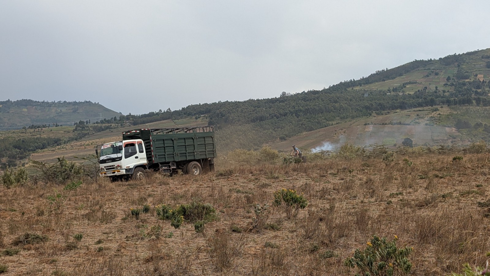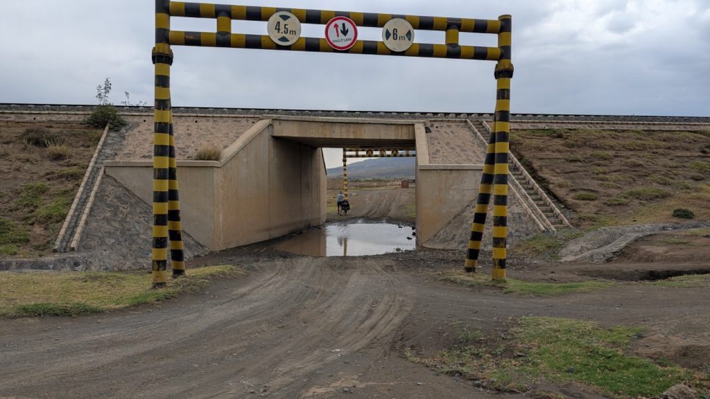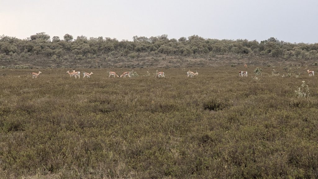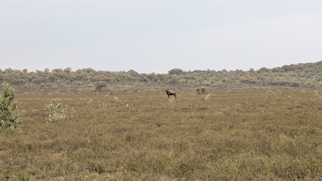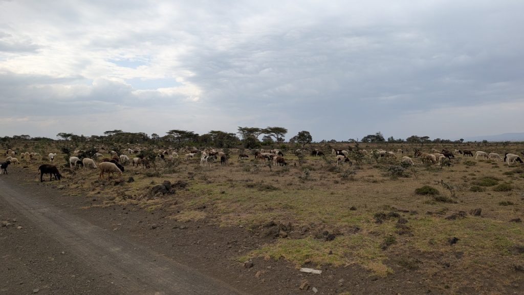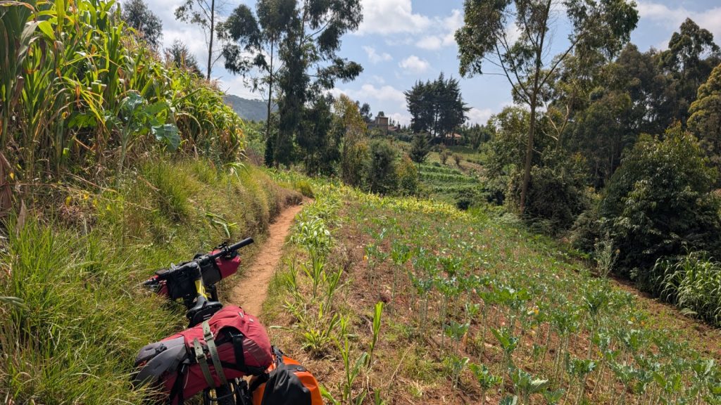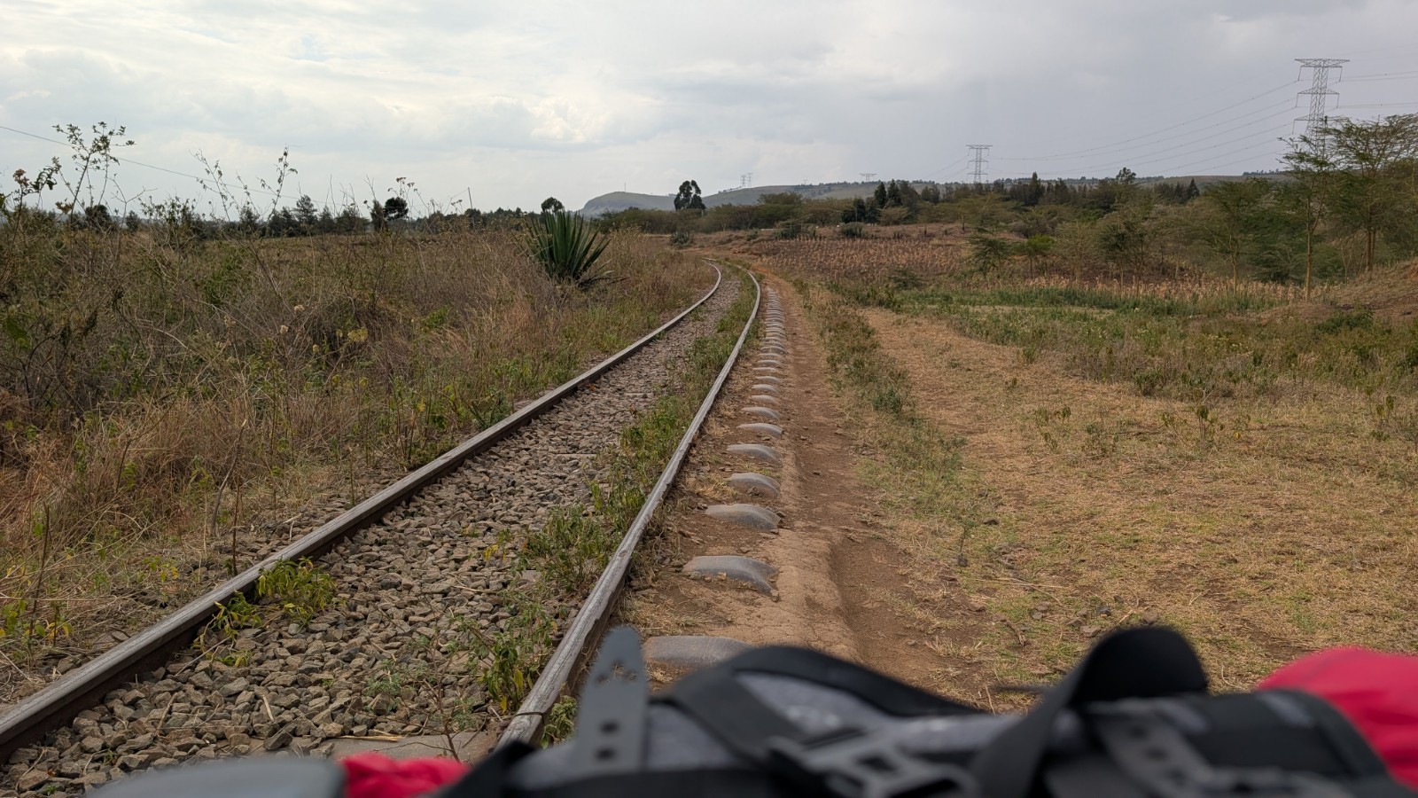 Schlussenddlich bogen wir an der Flyover Bridge der A104 ins Gelände ein. Zuvor stärkten wir uns allerdings im Imbis an einer Tankstelle mit Samosa und Pizza. In der folgenden Abfahrt sammelte Daniel ein paar herumliegendeä Kartoffeln auf und nur wenig später holte uns der bereits drohende Regen ein, den wir unter einem Busch aussaßen. Der Regen ließ langsam nach und so schlängelten wir uns über mehr oder weniger holprige Straßen an den Rand eines Vulkancraters. Entlang der Vulkanflanke führte ein schöner Singletrack. In der folgenden Abfahrt überholten wir einen LKW der sich mühevoll von Loch zu Loch schlich. Vorbei an Longonot führte uns der Weg durch die Kedong Range. Wir erblickten unsere ersten Garzellen, einen Büffel und Zebras, allerdings waren sie ja auf der Range eingesperrt. Auf teils recht sandigen Wegen ging es hinab und mit der Abenddämmerung erreichten wir den Naiwasha-See wo wir im YMCA mit unseren Zelten Unterschlupf fanden. Wir kochten mit unserer Gaskartusche Nudeln und Trockenfutter.
