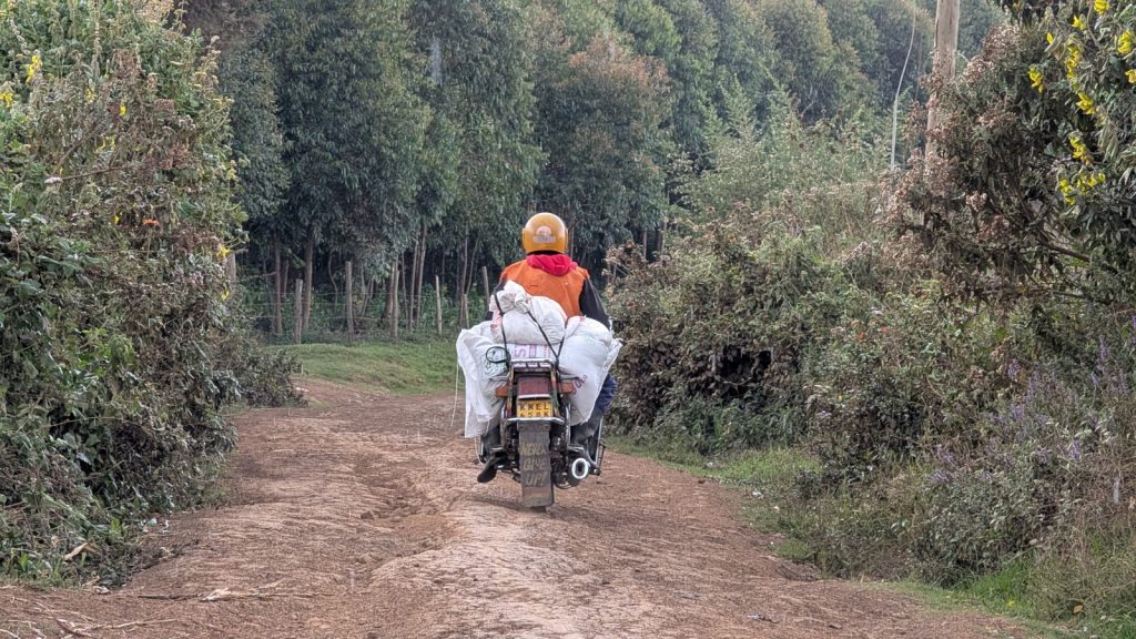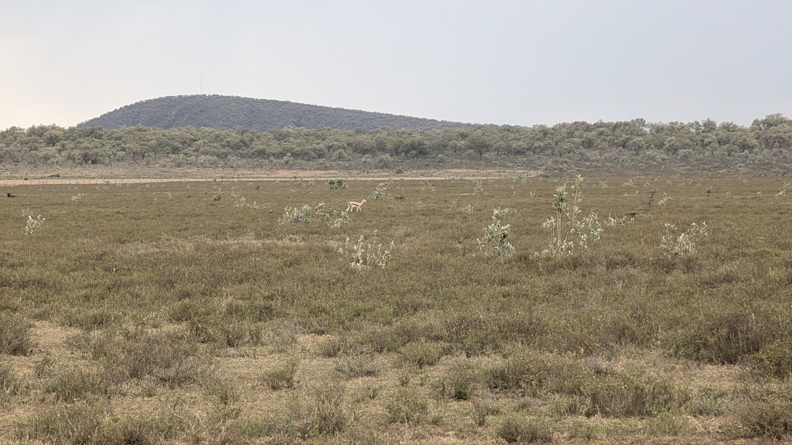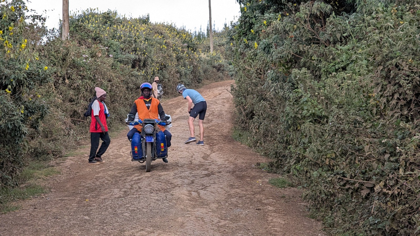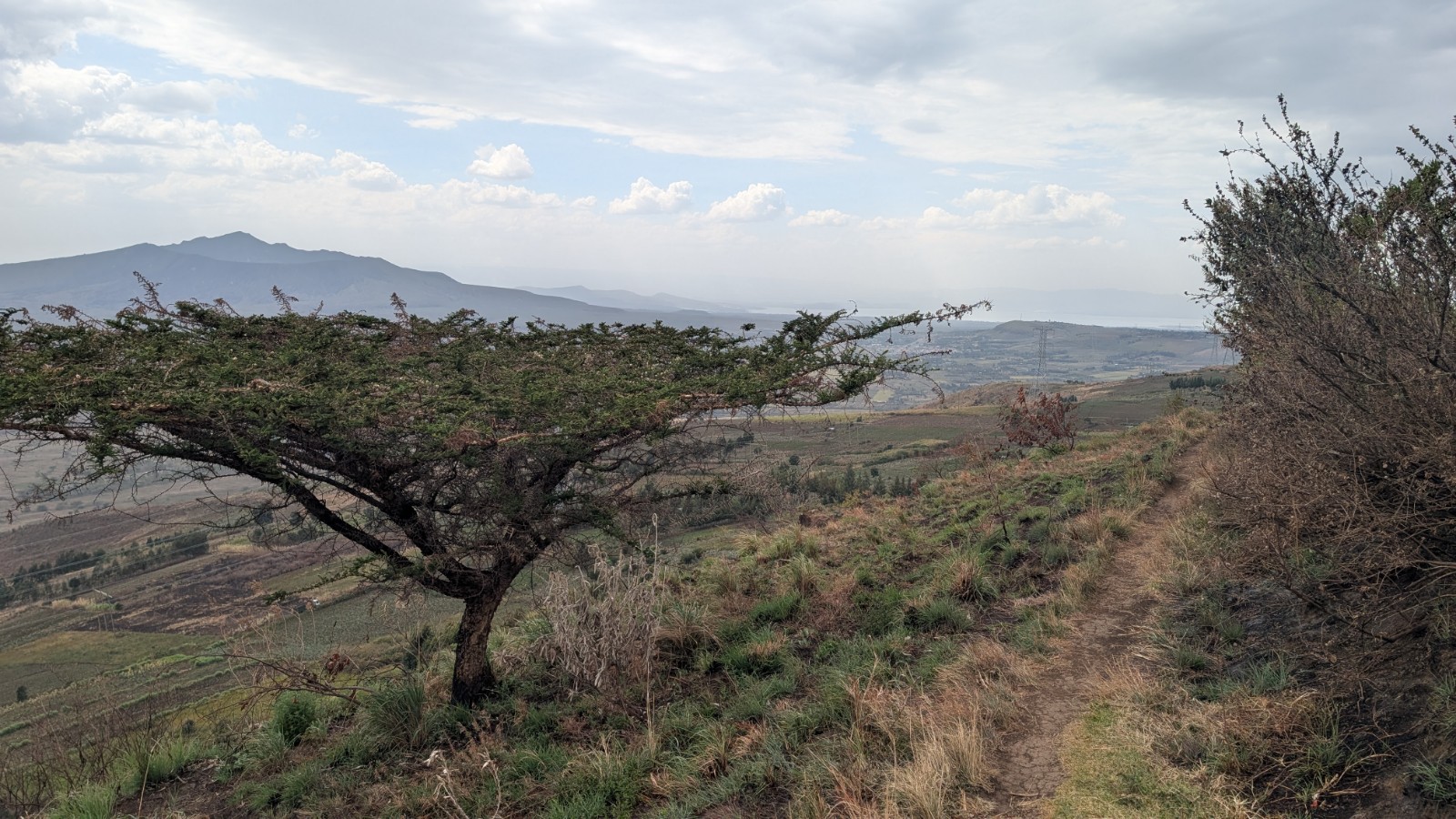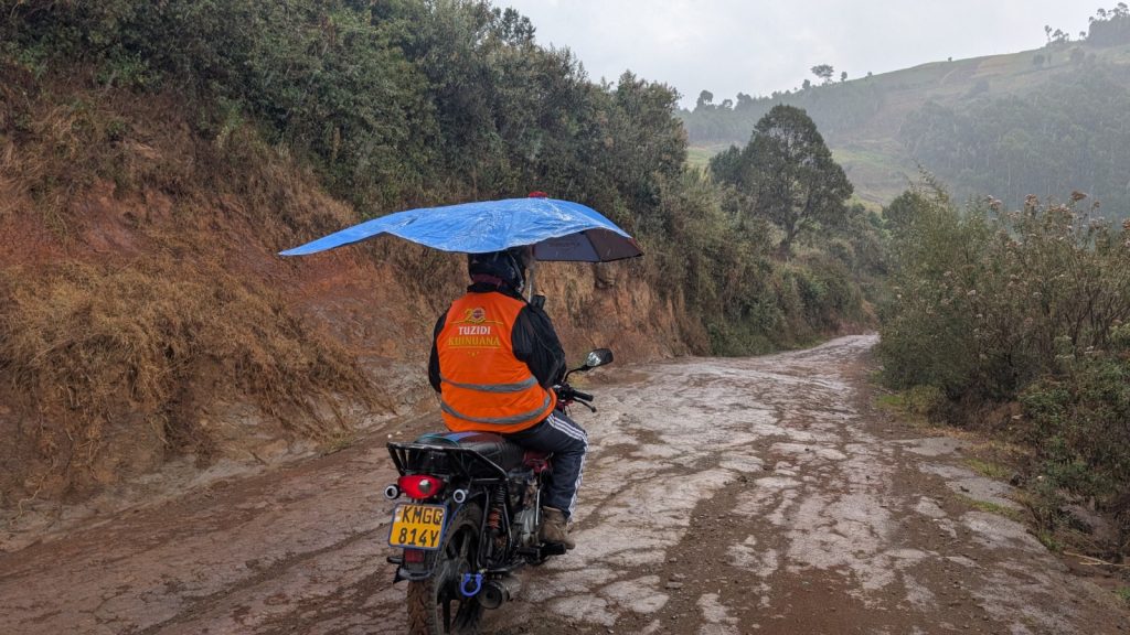 Schlussenddlich bogen wir an der Flyover Bridge der A104 ins Gelände ein. Zuvor stärkten wir uns allerdings im Imbis an einer Tankstelle mit Samosa und Pizza. In der folgenden Abfahrt sammelte Daniel ein paar herumliegendeä Kartoffeln auf und nur wenig später holte uns der bereits drohende Regen ein, den wir unter einem Busch aussaßen. Der Regen ließ langsam nach und so schlängelten wir uns über mehr oder weniger holprige Straßen an den Rand eines Vulkancraters. Entlang der Vulkanflanke führte ein schöner Singletrack. In der folgenden Abfahrt überholten wir einen LKW der sich mühevoll von Loch zu Loch schlich. Vorbei an Longonot führte uns der Weg durch die Kedong Range. Wir erblickten unsere ersten Garzellen, einen Büffel und Zebras, allerdings waren sie ja auf der Range eingesperrt. Auf teils recht sandigen Wegen ging es hinab und mit der Abenddämmerung erreichten wir den Naiwasha-See wo wir im YMCA mit unseren Zelten Unterschlupf fanden. Wir kochten mit unserer Gaskartusche Nudeln und Trockenfutter.