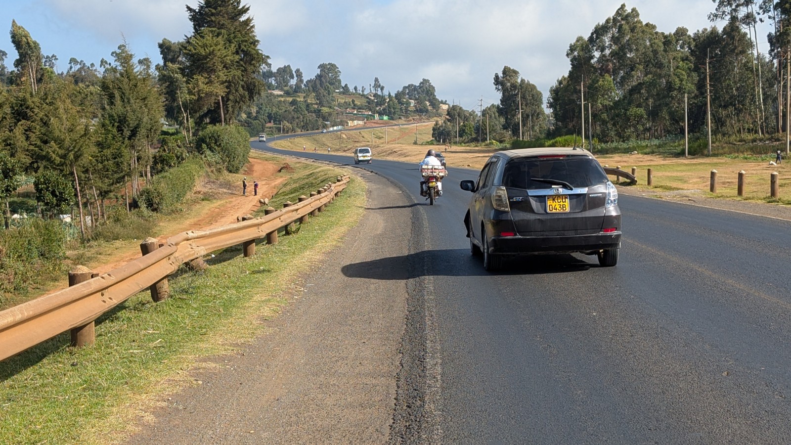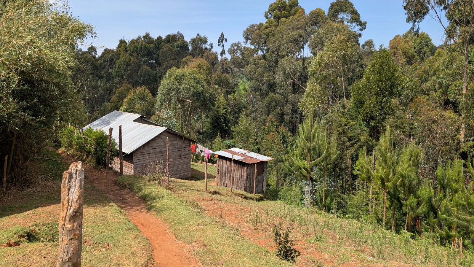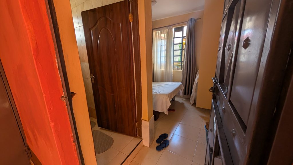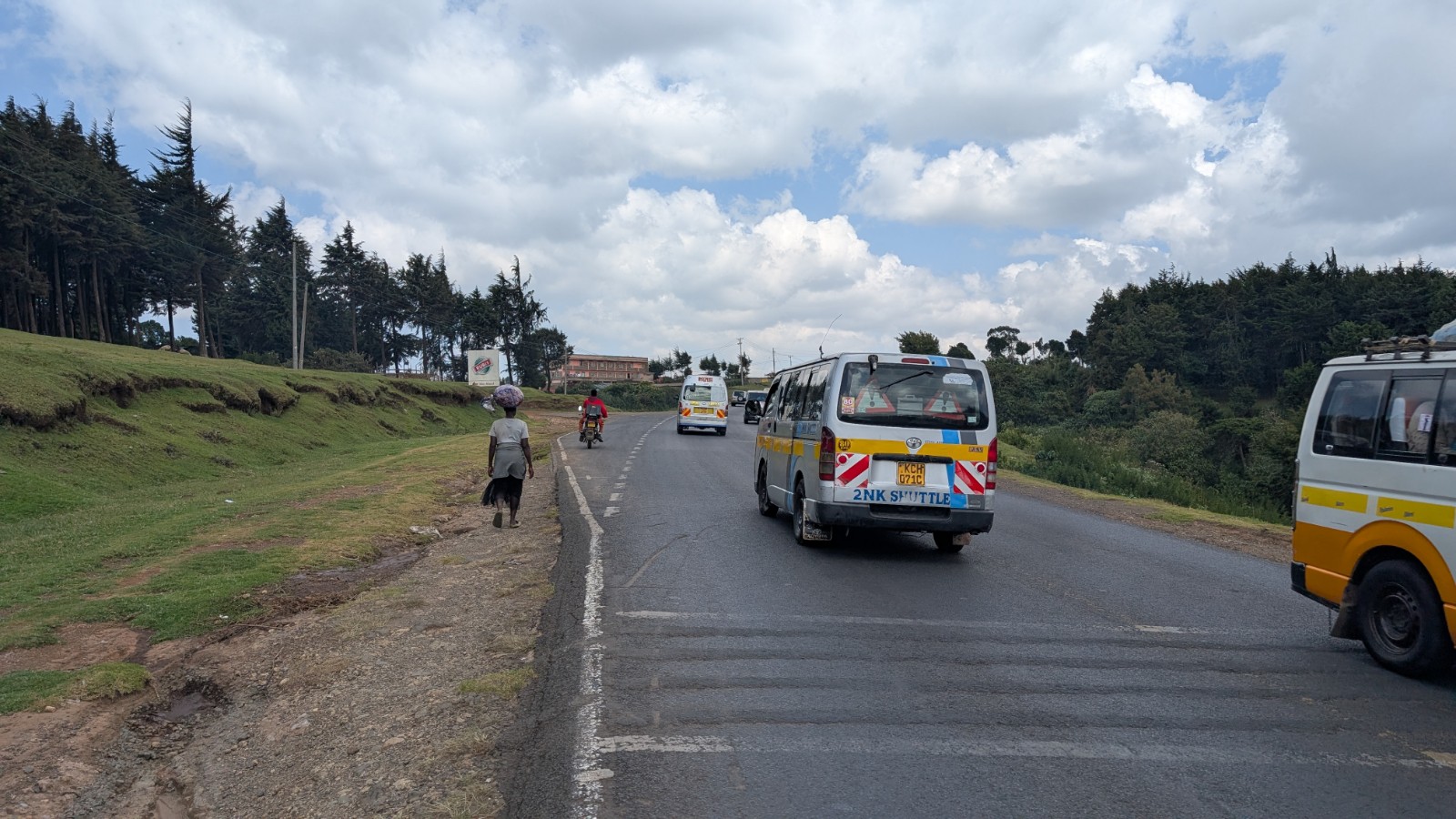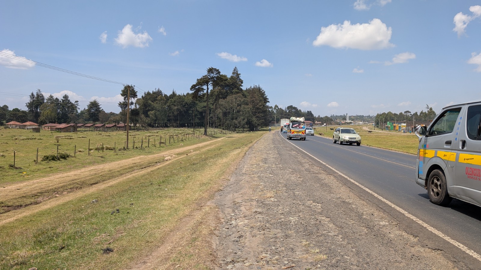 Schlussenddlich bogen wir an der Flyover Bridge der A104 ins Gelände ein. Zuvor stärkten wir uns allerdings im Imbis an einer Tankstelle mit Samosa und Pizza. In der folgenden Abfahrt sammelte Daniel ein paar herumliegendeä Kartoffeln auf und nur wenig später holte uns der bereits drohende Regen ein, den wir unter einem Busch aussaßen. Der Regen ließ langsam nach und so schlängelten wir uns über mehr oder weniger holprige Straßen an den Rand eines Vulkancraters. Entlang der Vulkanflanke führte ein schöner Singletrack. In der folgenden Abfahrt überholten wir einen LKW der sich mühevoll von Loch zu Loch schlich. Vorbei an Longonot führte uns der Weg durch die Kedong Range. Wir erblickten unsere ersten Garzellen, einen Büffel und Zebras, allerdings waren sie ja auf der Range eingesperrt. Auf teils recht sandigen Wegen ging es hinab und mit der Abenddämmerung erreichten wir den Naiwasha-See wo wir im YMCA mit unseren Zelten Unterschlupf fanden. Wir kochten mit unserer Gaskartusche Nudeln und Trockenfutter.