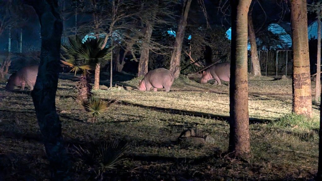 Der Abend sollte noch eine kleine Überraschung mit sich bringen.Gegen 9 Uhr grasten Hippos auf dem Camping-Gelände. Die Flusspferde kommen immer nachts zum Futtern aus den Seen wo sie sich tagsüber drin verstecken um keinen Sonnenbrand zu bekommen. Dabei legen sie bis zu 5 km Strecke zurück um an ihren lieblingsfressort zu gelangen.