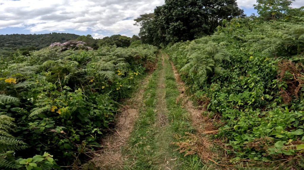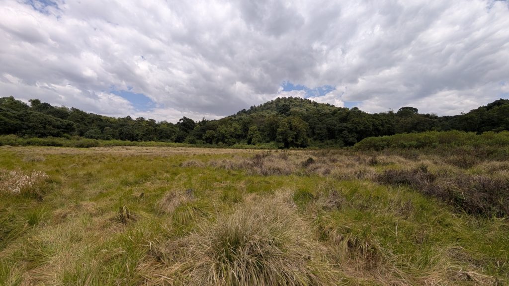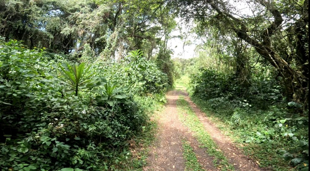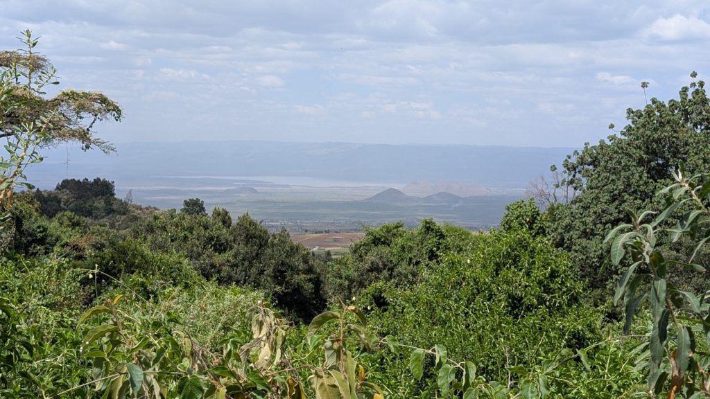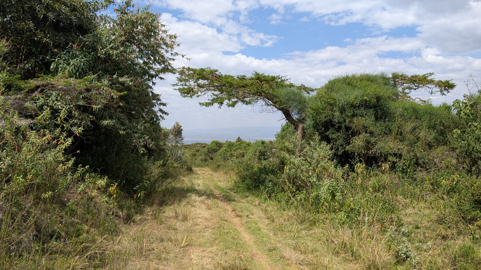 Wir setzten unsere Reise über Eburu Center zum richtigen Eingangstor in den Eburu Forest fort. Etwas später als tags zuvor angemeldet erreichten wir das Park-Büro, aber außer einer Imbis-Verkäuferin war keiner zu sehen. Gut eine Stunde warteten wir auf den Ranger. Währenddessen kam ein anderer Radler an, Karl aus Großbritannien. Er hatte deutlich weniger Gepäck an seinem Bike, z.B. fuhr er mit nur einem halben Schlafsack rum, denn für die obere Hälfte könne er auch eine Jacke anziehen. Immerhin hatte er auch eine große Kamera dabei, für die guten Fotos. Gemeinsam warteten wir auf den Ranger, tauschten uns aus und bezahlten dann auch den Park. Nach ein paar Kilometern im Park ließen wir Karl davon ziehen, er war vor allem Bergab deutlich schneller. Wir legten auch mal unsere Bikes beiseite und liefen einen Weg hinein, zu einem ausgetrockneten Kratersee, wo ein paar in Nairobi wohnenende Amerikaner am Wochenende zelteten.