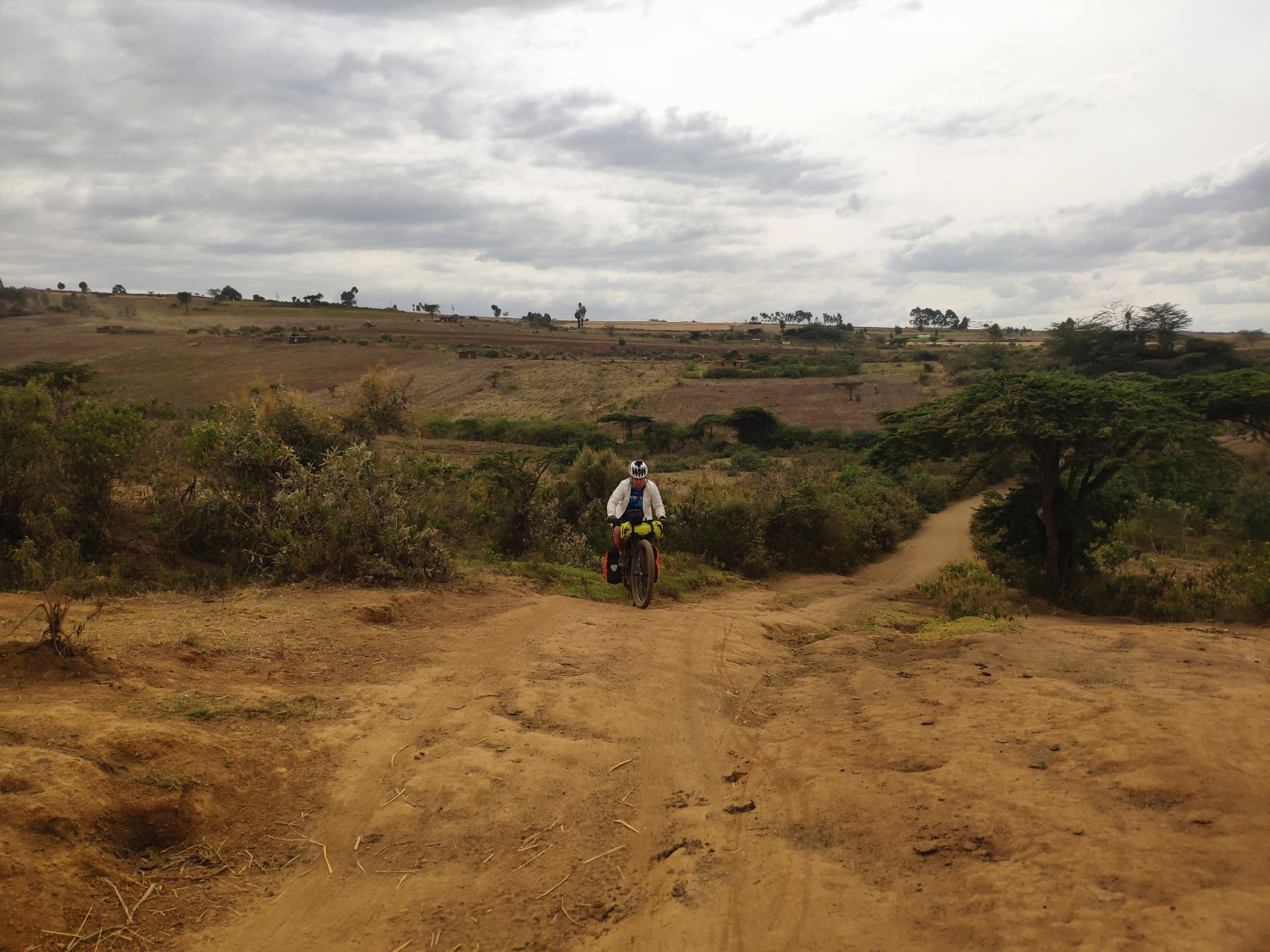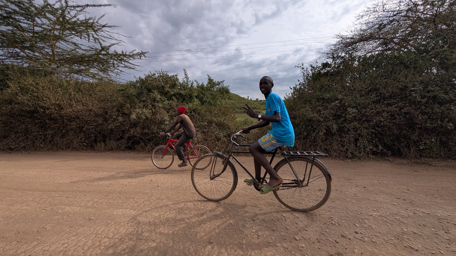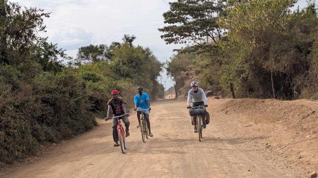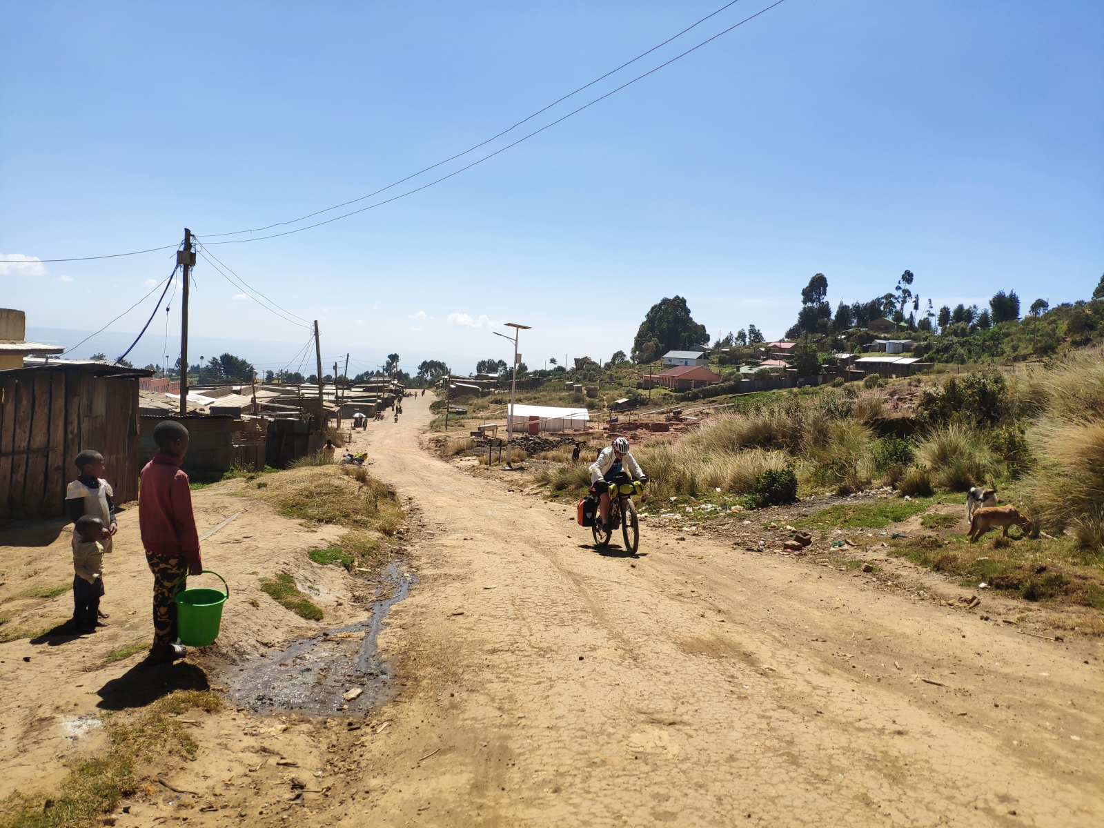 Eigentlich erwarteten wir uns etwas mehr Wildlife, zumindest Affen, aber es war weder so richtig was zu sehen noch viel zu hören. Die Tiere waren wohl im Mittagsschlaf. So folgte eine lange und schöne Abfahrt. Die Fahrt durch das Soysambu Conservancy war mittlerweile für Radfahrer gesperrt, nachdem wohl drei Radfahrer von nem Büffel attakiert wurden. Karl versorgte uns mit einem alternativen Track und so folgten wir ab Kongasis einer alten Eisenbahnlinien nach Osten für etwa 10 km bis zu den ersten Ausläufern von Gilgil wo unser Track nach Norden hin abbog. Unterwegs hatten wir zwei Mitradler, mit den sich vor allem Daniel intensiv unterhielt. Erstaunlich, wie schnell sie auf ihren Ein-Gang-Rädern unterwegs sind. Später überholten wir immer wieder mal einen etwas älteren Mann auf seinem afrikanischen Bike, lieferten uns fast ein kleines Rennen. In einem Anstieg fuhr Daniel in eine Sandgrube und das Rad fiel um, ganz schnell eilten Beobachter hin und warteten bis er auch wirklich wieder auf dem Bike saß und versicherte dass alles gut ist. Der Alte Mann verabschiedete sich an unserem Abzweig. Leider verlor sich kurz danach auch unser Track und wir mussten eine alternative Route finden. Wir folgten einem Weg parallel zu einer Hochspannungsleitung und Pipeline. Wir konnten bereits den Elementaite-See sehen, doch dann meldete sich der Gepäckträger von Daniel ab. Er war oben auf beiden Seiten gebrochen. Leider fehlte die Verbindung zum See und so bogen wir nach Osten ab um wieder auf eine Dorfstraße zu gelangen. Ohne echtes Kartenwerk gar nicht so leicht, aber wir fragten uns durch. Der Blick auf die Karte an meinem Smartphone von einem Mädchen verlief etwas ins Leere, aber als ich nach Hauptstraße fragte zeigte sie uns eine Richtung. Vermutlich verwenden sie auf dem Land nicht so viele Karten. Nach ein wenig querfeldein fanden wir zurück auf die Schotterstraße. Die Zeit schritt schon wieder voran und das Tageslicht sollte sich bald dem Ende neigen.