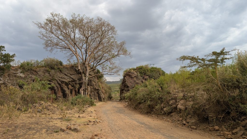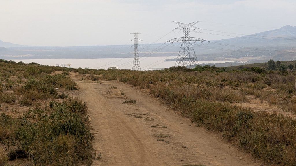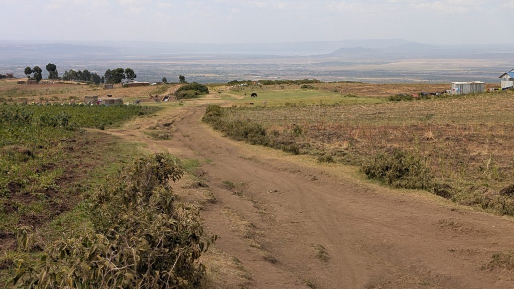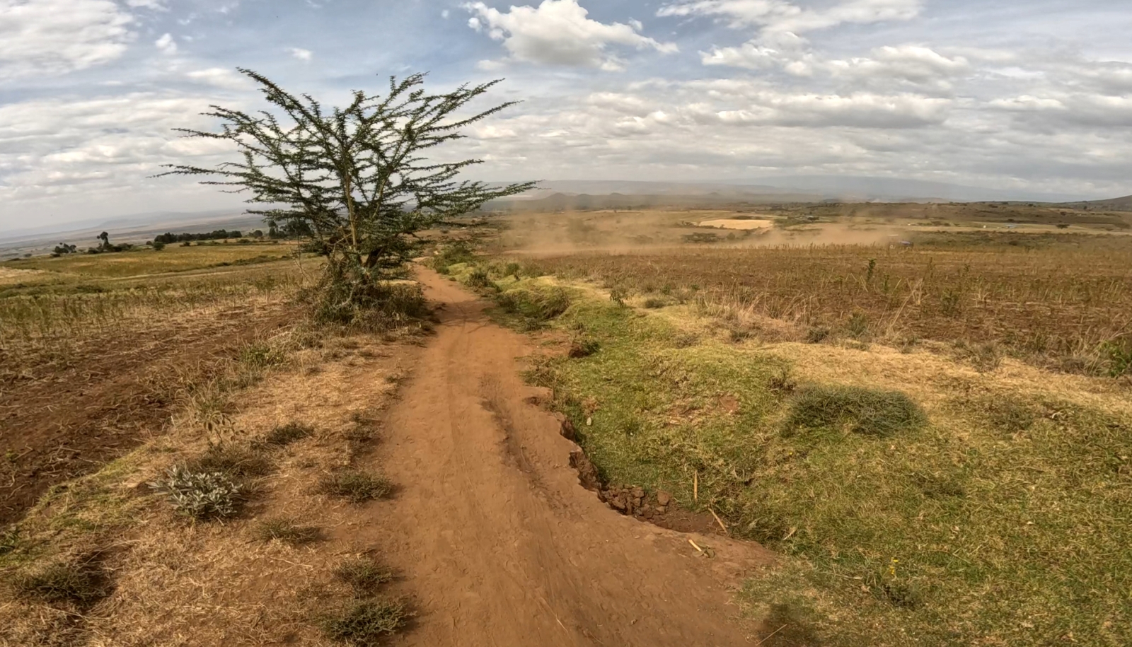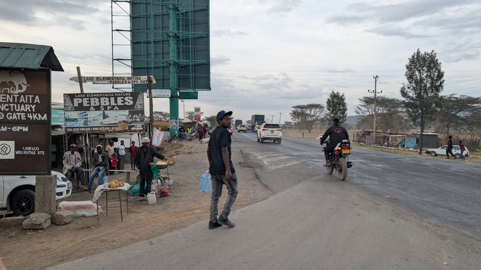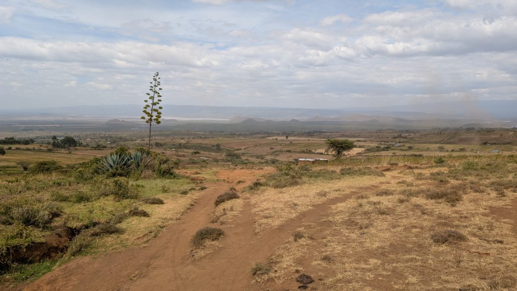 Eigentlich erwarteten wir uns etwas mehr Wildlife, zumindest Affen, aber es war weder so richtig was zu sehen noch viel zu hören. Die Tiere waren wohl im Mittagsschlaf. So folgte eine lange und schöne Abfahrt. Die Fahrt durch das Soysambu Conservancy war mittlerweile für Radfahrer gesperrt, nachdem wohl drei Radfahrer von nem Büffel attakiert wurden. Karl versorgte uns mit einem alternativen Track und so folgten wir ab Kongasis einer alten Eisenbahnlinien nach Osten für etwa 10 km bis zu den ersten Ausläufern von Gilgil wo unser Track nach Norden hin abbog. Unterwegs hatten wir zwei Mitradler, mit den sich vor allem Daniel intensiv unterhielt. Erstaunlich, wie schnell sie auf ihren Ein-Gang-Rädern unterwegs sind. Später überholten wir immer wieder mal einen etwas älteren Mann auf seinem afrikanischen Bike, lieferten uns fast ein kleines Rennen. In einem Anstieg fuhr Daniel in eine Sandgrube und das Rad fiel um, ganz schnell eilten Beobachter hin und warteten bis er auch wirklich wieder auf dem Bike saß und versicherte dass alles gut ist. Der Alte Mann verabschiedete sich an unserem Abzweig. Leider verlor sich kurz danach auch unser Track und wir mussten eine alternative Route finden. Wir folgten einem Weg parallel zu einer Hochspannungsleitung und Pipeline. Wir konnten bereits den Elementaite-See sehen, doch dann meldete sich der Gepäckträger von Daniel ab. Er war oben auf beiden Seiten gebrochen. Leider fehlte die Verbindung zum See und so bogen wir nach Osten ab um wieder auf eine Dorfstraße zu gelangen. Ohne echtes Kartenwerk gar nicht so leicht, aber wir fragten uns durch. Der Blick auf die Karte an meinem Smartphone von einem Mädchen verlief etwas ins Leere, aber als ich nach Hauptstraße fragte zeigte sie uns eine Richtung. Vermutlich verwenden sie auf dem Land nicht so viele Karten. Nach ein wenig querfeldein fanden wir zurück auf die Schotterstraße. Die Zeit schritt schon wieder voran und das Tageslicht sollte sich bald dem Ende neigen.