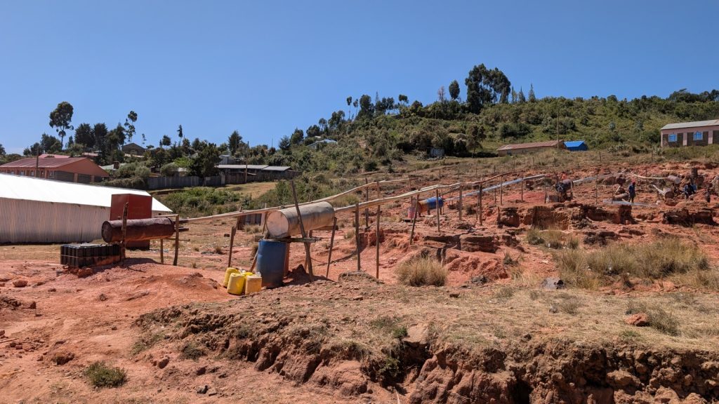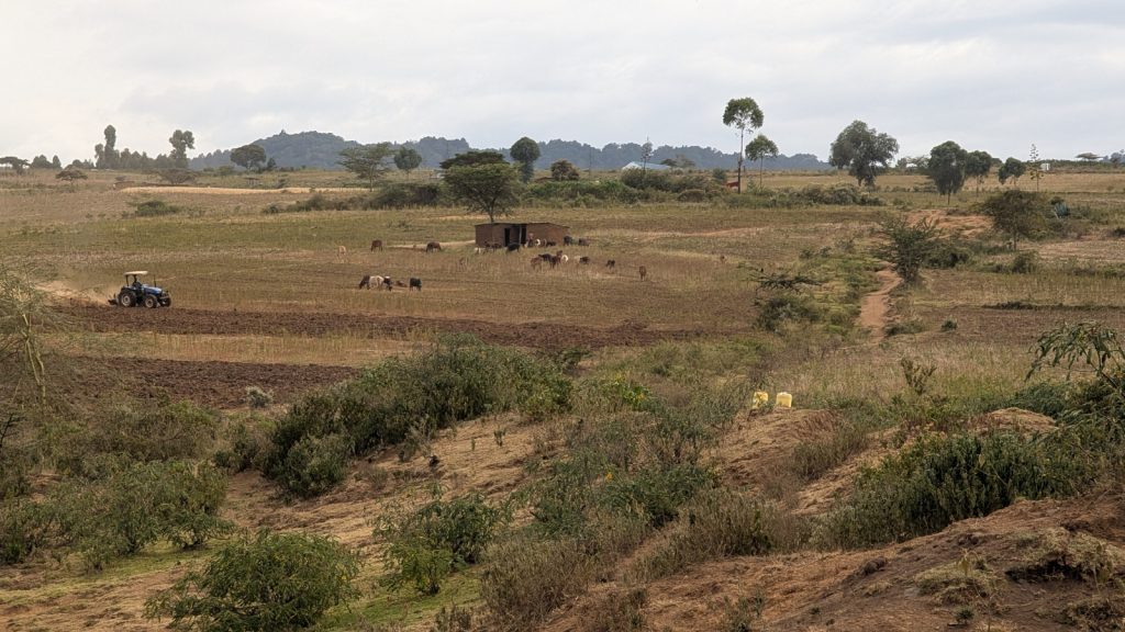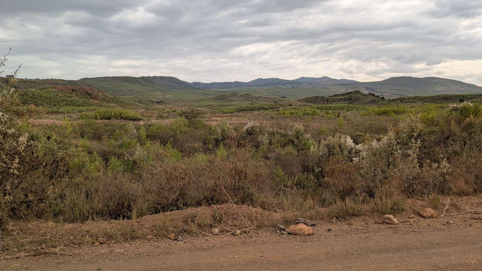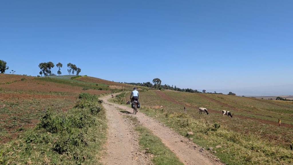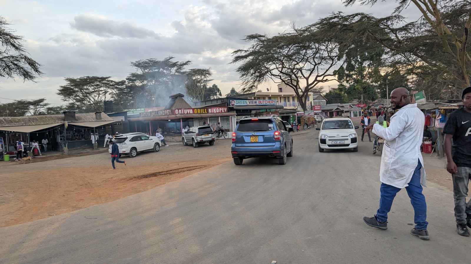 Eigentlich erwarteten wir uns etwas mehr Wildlife, zumindest Affen, aber es war weder so richtig was zu sehen noch viel zu hören. Die Tiere waren wohl im Mittagsschlaf. So folgte eine lange und schöne Abfahrt. Die Fahrt durch das Soysambu Conservancy war mittlerweile für Radfahrer gesperrt, nachdem wohl drei Radfahrer von nem Büffel attakiert wurden. Karl versorgte uns mit einem alternativen Track und so folgten wir ab Kongasis einer alten Eisenbahnlinien nach Osten für etwa 10 km bis zu den ersten Ausläufern von Gilgil wo unser Track nach Norden hin abbog. Unterwegs hatten wir zwei Mitradler, mit den sich vor allem Daniel intensiv unterhielt. Erstaunlich, wie schnell sie auf ihren Ein-Gang-Rädern unterwegs sind. Später überholten wir immer wieder mal einen etwas älteren Mann auf seinem afrikanischen Bike, lieferten uns fast ein kleines Rennen. In einem Anstieg fuhr Daniel in eine Sandgrube und das Rad fiel um, ganz schnell eilten Beobachter hin und warteten bis er auch wirklich wieder auf dem Bike saß und versicherte dass alles gut ist. Der Alte Mann verabschiedete sich an unserem Abzweig. Leider verlor sich kurz danach auch unser Track und wir mussten eine alternative Route finden. Wir folgten einem Weg parallel zu einer Hochspannungsleitung und Pipeline. Wir konnten bereits den Elementaite-See sehen, doch dann meldete sich der Gepäckträger von Daniel ab. Er war oben auf beiden Seiten gebrochen. Leider fehlte die Verbindung zum See und so bogen wir nach Osten ab um wieder auf eine Dorfstraße zu gelangen. Ohne echtes Kartenwerk gar nicht so leicht, aber wir fragten uns durch. Der Blick auf die Karte an meinem Smartphone von einem Mädchen verlief etwas ins Leere, aber als ich nach Hauptstraße fragte zeigte sie uns eine Richtung. Vermutlich verwenden sie auf dem Land nicht so viele Karten. Nach ein wenig querfeldein fanden wir zurück auf die Schotterstraße. Die Zeit schritt schon wieder voran und das Tageslicht sollte sich bald dem Ende neigen.