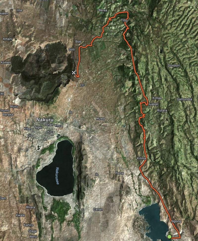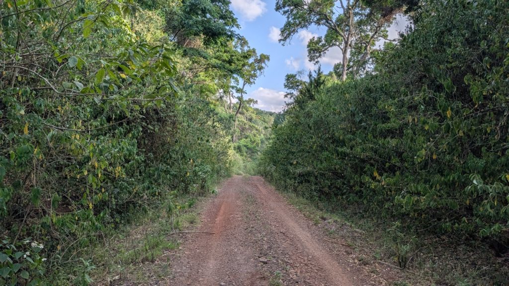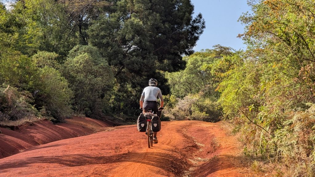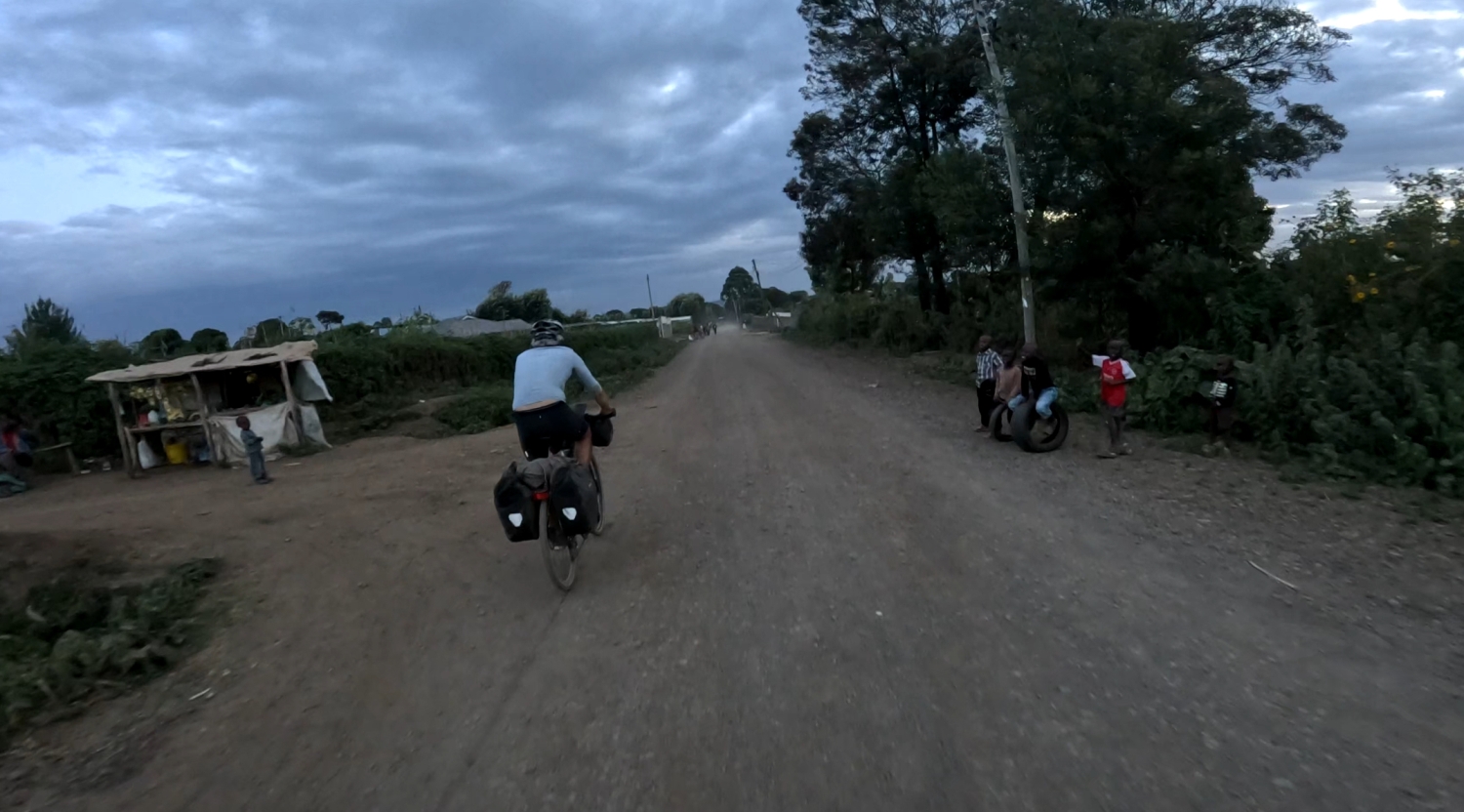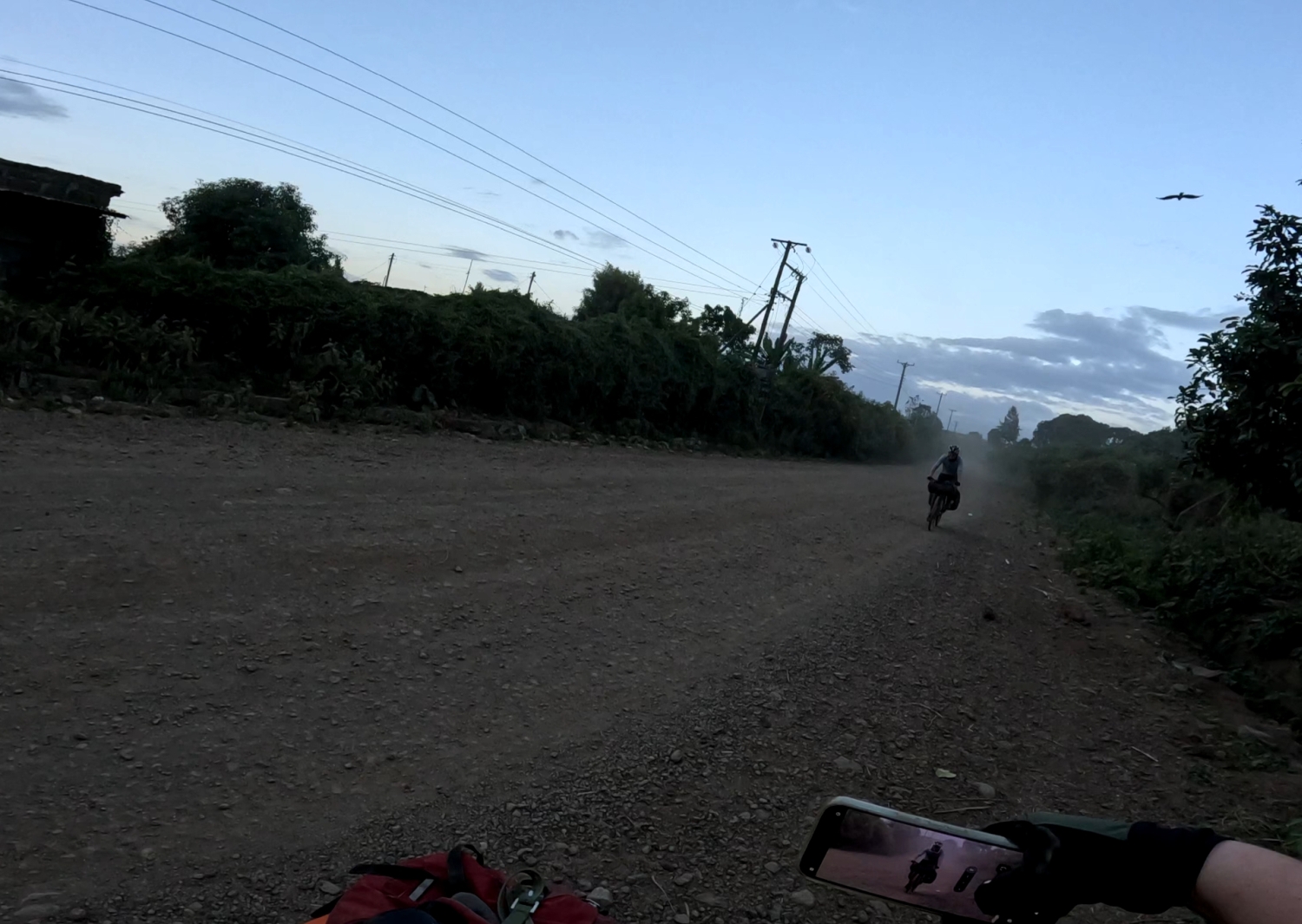Gut 1.5 h später nach dem Bastelstop in Kombination mit einer ausgedehnten Mittagspause radelten wir endlich weiter. Lagen wir zuvor noch gut im Plan hatten wir nun schon wieder damit zu kämpfen nicht in die Dunkelheit zu geraten. Wir hatten zwar eine Option die Strecke abzukürzen, aber irgendwie hatten wir Lust auch noch durch einen Wald zu radeln. Nach einem letzten ernsthaften Anstieg auf Teer erreichten wir den Dundori Wald. Zu Beginn gab es dort Holzfällarbeiten, die sahen legal aus. Später übernahmen die Zikaden den Ton im Wald. Der Wald war richtig schön, teils aufgeforstet, teils urig. Daniel entdeckte Affen hoch oben in den Bäumen. Später sprangen noch welche über seinen Rücken. Wir hatten eine kleine Bachquerung und gönnten uns auf einer Wiese noch einen Fanta-Cola-Tomaten-Stopp um nochmal Energie für die letzten Kilometer zu sammeln. Die Dämmerung saß uns aber schon fast im Nacken. Ich gab Daniel mein Telefon, so dass er auch die Strecke sehen konnte. Ich eilte etwas vorraus, da ich in den Abfahrten meist etwas schneller war, während Daniel die Anstiege etwas rasanter nahm. Wir vereinbarten eine Stelle wo wir uns spätestens wieder treffen wollten. Ich nutzte meinen Vorsprung um schonmal die Radbeleuchtung herauszukramen und anzubauen und war genau fertig als Daniel von hinten angefegt kam. Den Rest der Strecke fuhren wir dann wieder zusammen. Was waren wir froh auch mal wieder Teer unter den Reifen zu haben. Ich lieferte mir noch ein kleines Rennen mit einem Traktor und die letzten 2-3 Kilometer bis zum Zeltplatz legten wir in fast völliger Dunkelheit zurück. In den Ortschaften herrschte noch reges Treiben, vermutlich weil es dann auch nichtmehr so heiß war wie tagsüber. Unsere Zelte stellten wir auf die Terasse einer der Hütten, von denen wir auch das Bad nutzen konnten. Für 1000 KES kamen wir da unter. Wir trafen auch Karl wieder, der einen Ruhetag eingelegt hatte bekamen ein super Essen und sackten nach etwas Entspannung auf der Terasse in unsere Isomatten.