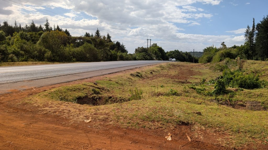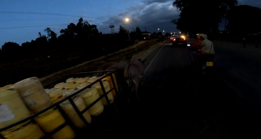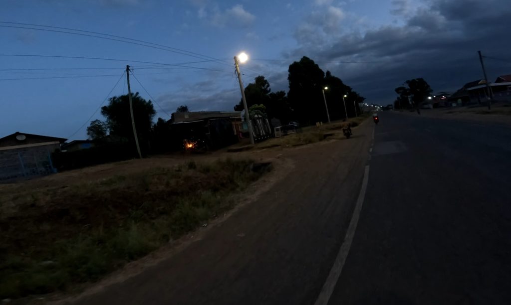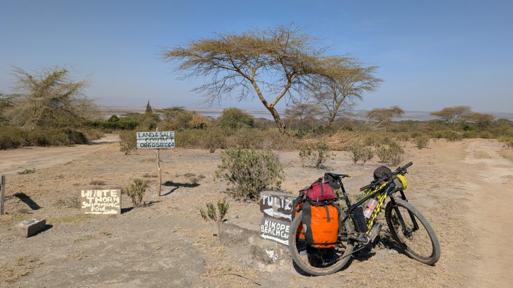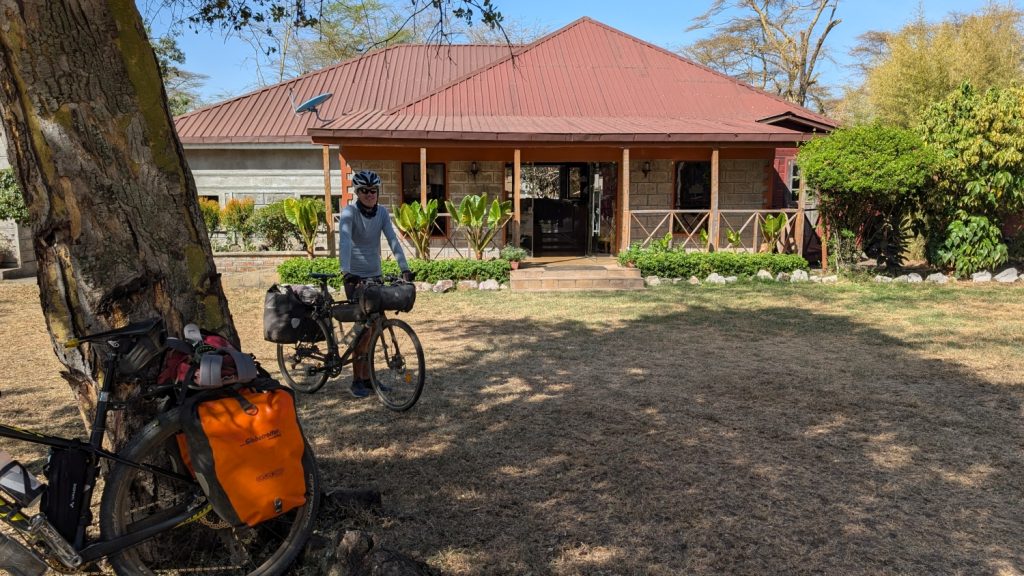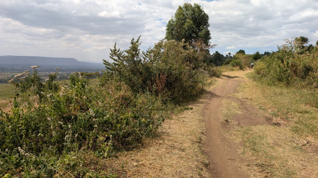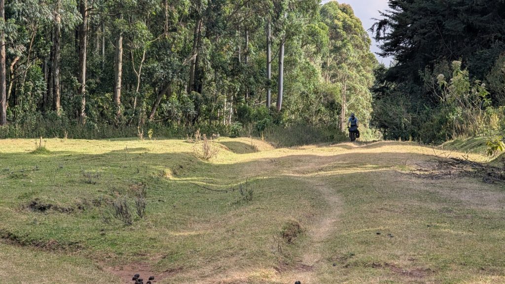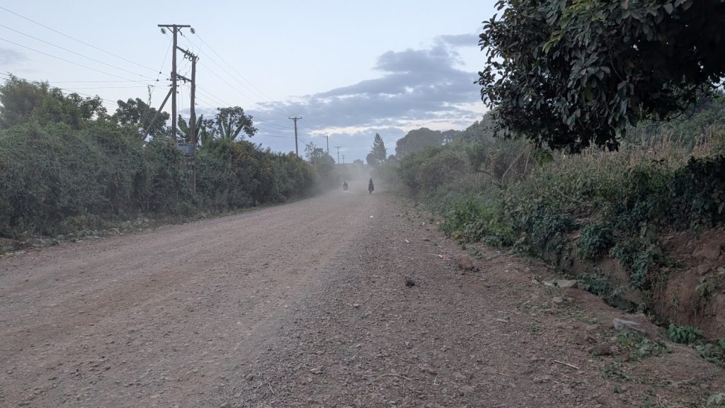 Gut 1.5 h später nach dem Bastelstop in Kombination mit einer ausgedehnten Mittagspause radelten wir endlich weiter. Lagen wir zuvor noch gut im Plan hatten wir nun schon wieder damit zu kämpfen nicht in die Dunkelheit zu geraten. Wir hatten zwar eine Option die Strecke abzukürzen, aber irgendwie hatten wir Lust auch noch durch einen Wald zu radeln. Nach einem letzten ernsthaften Anstieg auf Teer erreichten wir den Dundori Wald. Zu Beginn gab es dort Holzfällarbeiten, die sahen legal aus. Später übernahmen die Zikaden den Ton im Wald. Der Wald war richtig schön, teils aufgeforstet, teils urig. Daniel entdeckte Affen hoch oben in den Bäumen. Später sprangen noch welche über seinen Rücken. Wir hatten eine kleine Bachquerung und gönnten uns auf einer Wiese noch einen Fanta-Cola-Tomaten-Stopp um nochmal Energie für die letzten Kilometer zu sammeln. Die Dämmerung saß uns aber schon fast im Nacken. Ich gab Daniel mein Telefon, so dass er auch die Strecke sehen konnte. Ich eilte etwas vorraus, da ich in den Abfahrten meist etwas schneller war, während Daniel die Anstiege etwas rasanter nahm. Wir vereinbarten eine Stelle wo wir uns spätestens wieder treffen wollten. Ich nutzte meinen Vorsprung um schonmal die Radbeleuchtung herauszukramen und anzubauen und war genau fertig als Daniel von hinten angefegt kam. Den Rest der Strecke fuhren wir dann wieder zusammen. Was waren wir froh auch mal wieder Teer unter den Reifen zu haben. Ich lieferte mir noch ein kleines Rennen mit einem Traktor und die letzten 2-3 Kilometer bis zum Zeltplatz legten wir in fast völliger Dunkelheit zurück. In den Ortschaften herrschte noch reges Treiben, vermutlich weil es dann auch nichtmehr so heiß war wie tagsüber. Unsere Zelte stellten wir auf die Terasse einer der Hütten, von denen wir auch das Bad nutzen konnten. Für 1000 KES kamen wir da unter. Wir trafen auch Karl wieder, der einen Ruhetag eingelegt hatte bekamen ein super Essen und sackten nach etwas Entspannung auf der Terasse in unsere Isomatten.