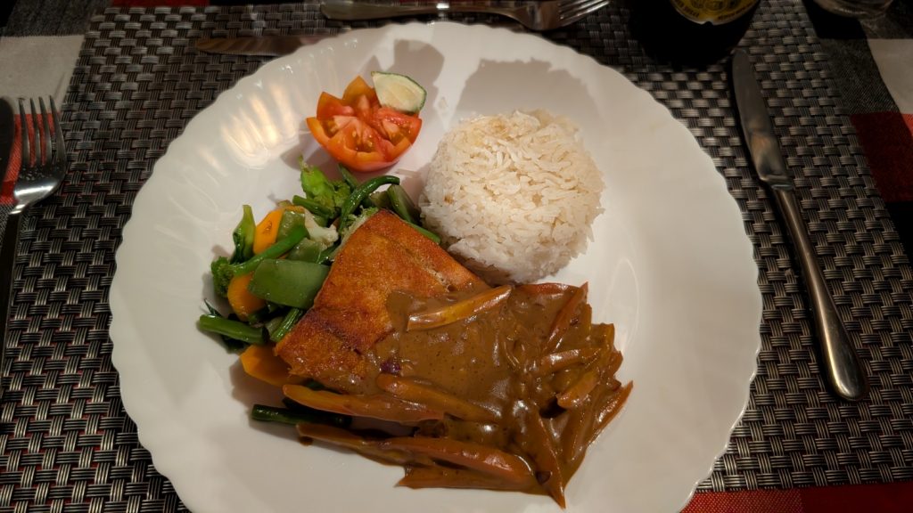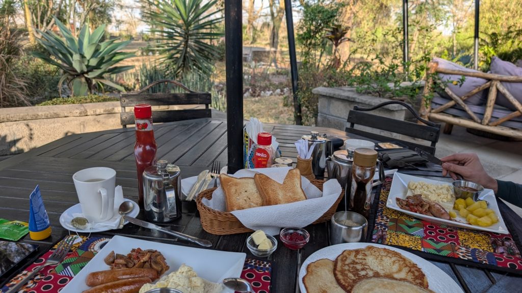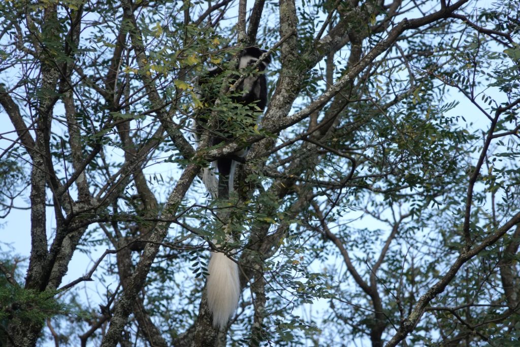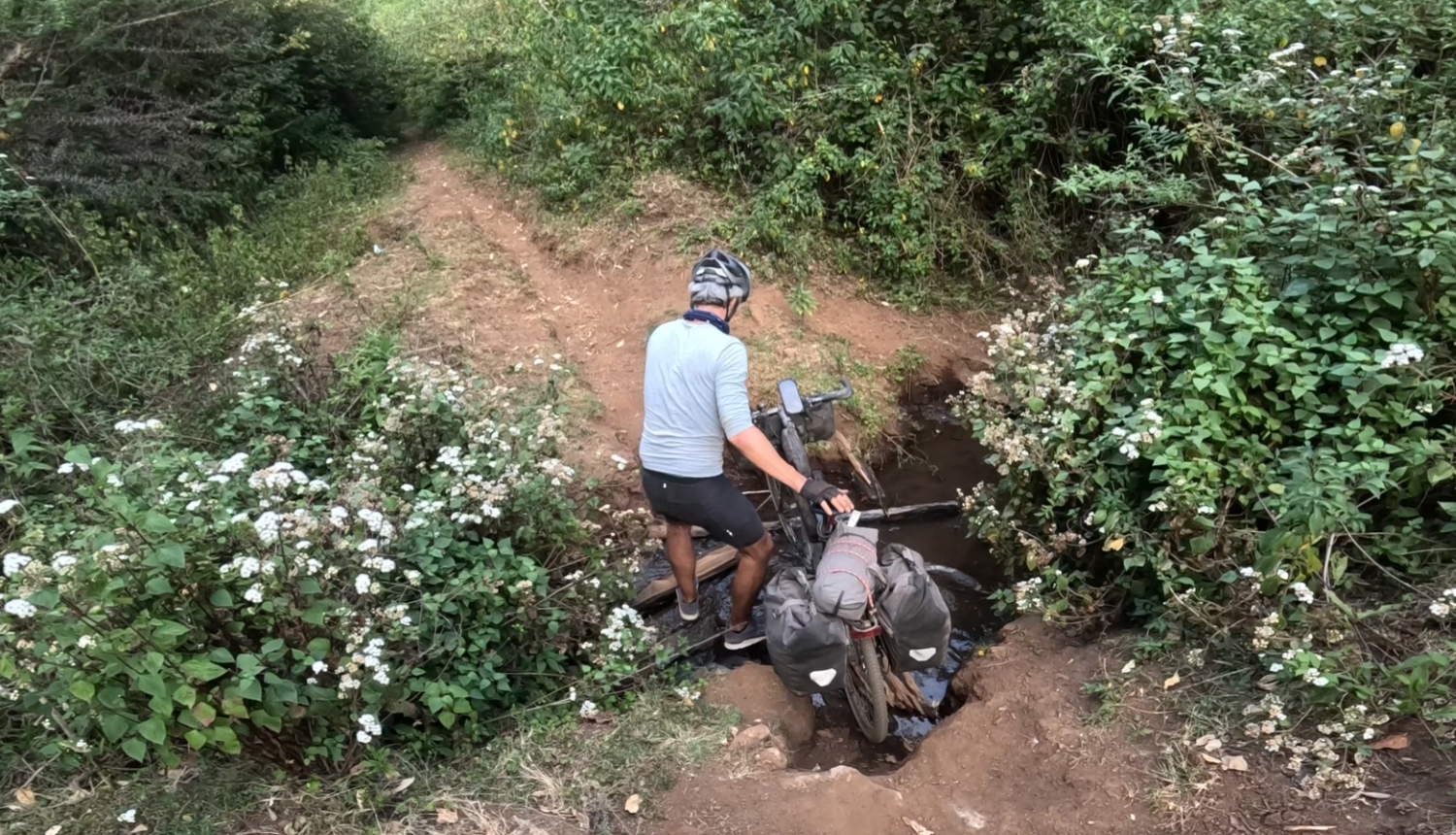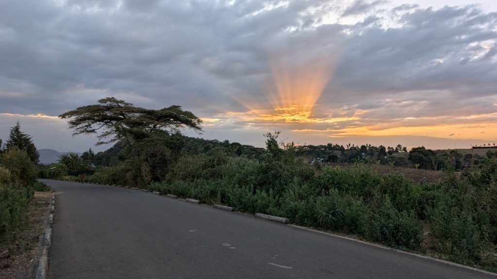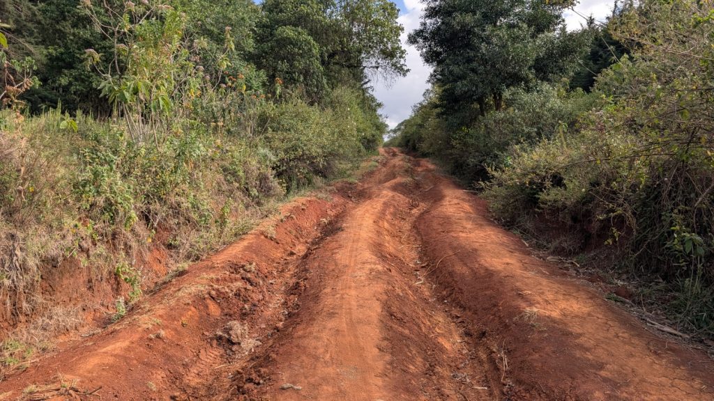 Gut 1.5 h später nach dem Bastelstop in Kombination mit einer ausgedehnten Mittagspause radelten wir endlich weiter. Lagen wir zuvor noch gut im Plan hatten wir nun schon wieder damit zu kämpfen nicht in die Dunkelheit zu geraten. Wir hatten zwar eine Option die Strecke abzukürzen, aber irgendwie hatten wir Lust auch noch durch einen Wald zu radeln. Nach einem letzten ernsthaften Anstieg auf Teer erreichten wir den Dundori Wald. Zu Beginn gab es dort Holzfällarbeiten, die sahen legal aus. Später übernahmen die Zikaden den Ton im Wald. Der Wald war richtig schön, teils aufgeforstet, teils urig. Daniel entdeckte Affen hoch oben in den Bäumen. Später sprangen noch welche über seinen Rücken. Wir hatten eine kleine Bachquerung und gönnten uns auf einer Wiese noch einen Fanta-Cola-Tomaten-Stopp um nochmal Energie für die letzten Kilometer zu sammeln. Die Dämmerung saß uns aber schon fast im Nacken. Ich gab Daniel mein Telefon, so dass er auch die Strecke sehen konnte. Ich eilte etwas vorraus, da ich in den Abfahrten meist etwas schneller war, während Daniel die Anstiege etwas rasanter nahm. Wir vereinbarten eine Stelle wo wir uns spätestens wieder treffen wollten. Ich nutzte meinen Vorsprung um schonmal die Radbeleuchtung herauszukramen und anzubauen und war genau fertig als Daniel von hinten angefegt kam. Den Rest der Strecke fuhren wir dann wieder zusammen. Was waren wir froh auch mal wieder Teer unter den Reifen zu haben. Ich lieferte mir noch ein kleines Rennen mit einem Traktor und die letzten 2-3 Kilometer bis zum Zeltplatz legten wir in fast völliger Dunkelheit zurück. In den Ortschaften herrschte noch reges Treiben, vermutlich weil es dann auch nichtmehr so heiß war wie tagsüber. Unsere Zelte stellten wir auf die Terasse einer der Hütten, von denen wir auch das Bad nutzen konnten. Für 1000 KES kamen wir da unter. Wir trafen auch Karl wieder, der einen Ruhetag eingelegt hatte bekamen ein super Essen und sackten nach etwas Entspannung auf der Terasse in unsere Isomatten.