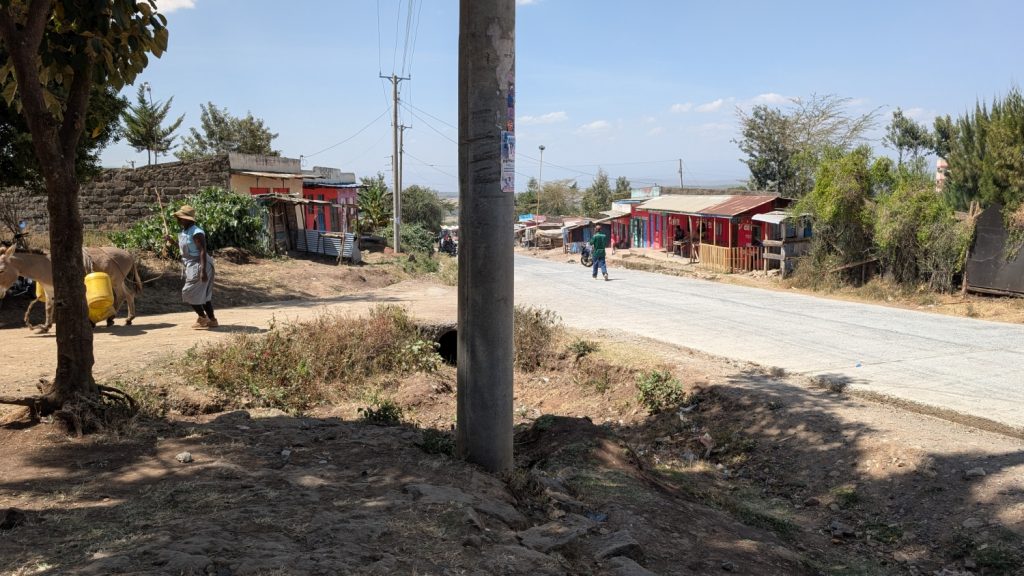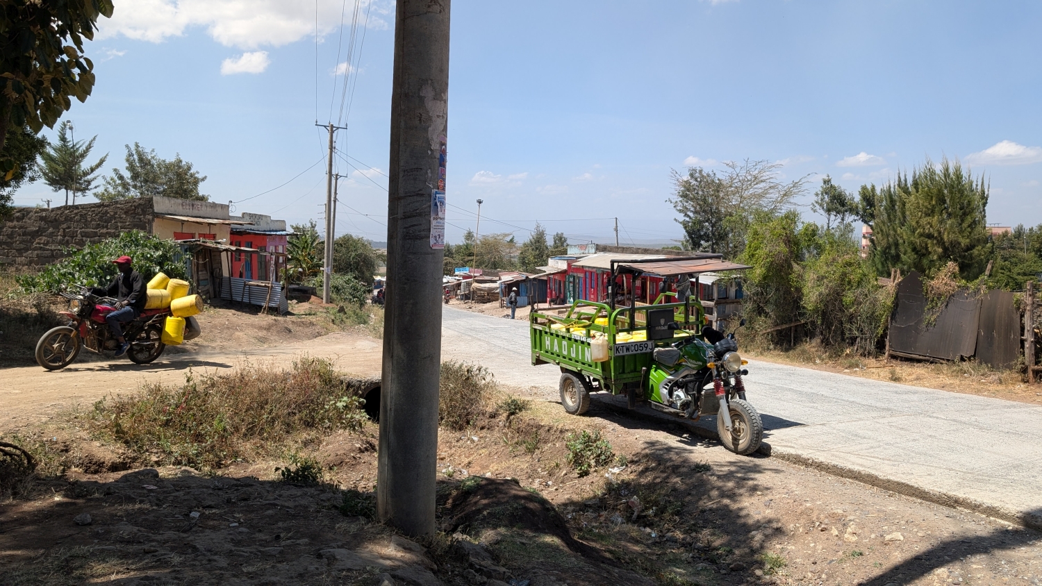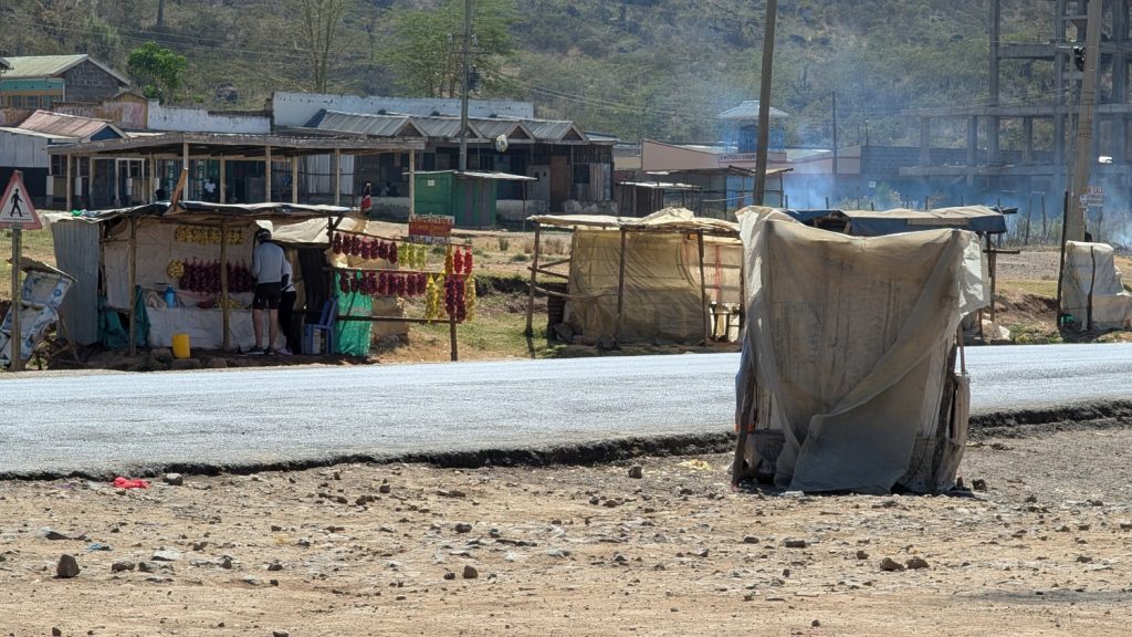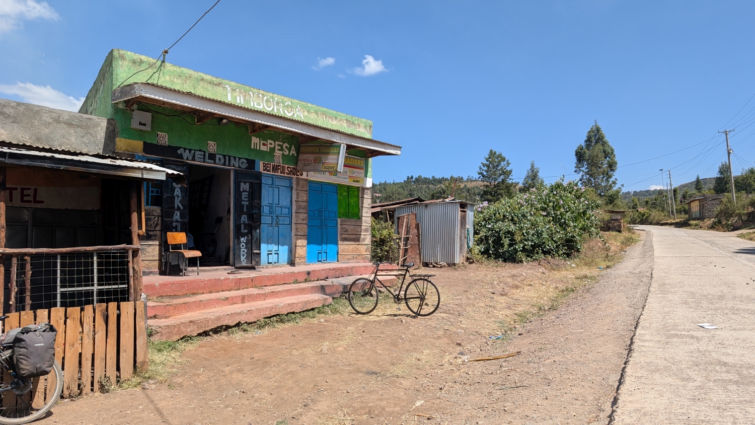 Am Eingang zum Sambusoy Conservancy bogen wir wieder auf den Track ein und verließen die Straße. Nach wenigen Metern wollte uns ein indischstämmiger Einwohner seinen Dienst gegen Geld anbieten. Er meinte es sei schwierig sich zu orientieren und er könne uns zeigen, wo wir am besten langradeln könnten. Na immerhin fragte er nach bezahlter Arbeit und nicht direkt nach Geld. Wir zogen weiter und leicht wellig verlief die Schotterstraße weiter gen Norden nach Mbaruk. Ab da begann der nächste richtige Anstieg, teilweise recht steil. Wir profitierten von den ausgelegten Betonplatten und gönnten uns im oberen Ortsteil von Mbaruk ein kleine Cola und Mango-Pause. Im Schatten sitzend beobachteten wir das Dorftreiben gegenüber einer Bar und Schweißerei. Ich tippe dass dort unter anderem die breiten Gepäckträger geschweißt wurden. Es kamen auch mal Einwohner vorbei, die nach Geld fragten. An den Anblick, dass jemand mit seiner Machete vor uns steht und nach Geld fragte gewöhnten wir uns so langsam, schließlich war das ein wichtiges Utensil bei der Feldarbeit.