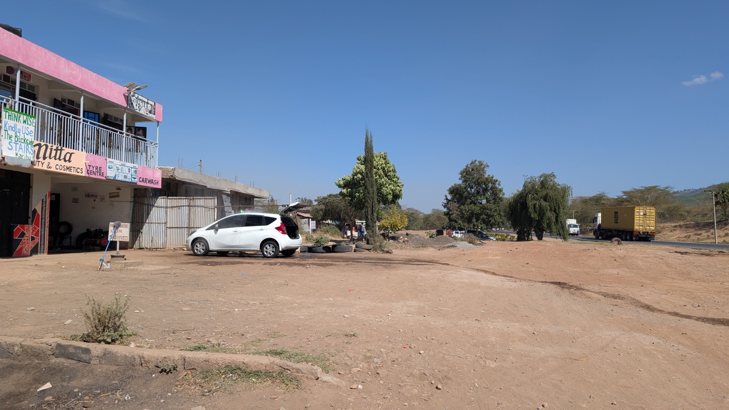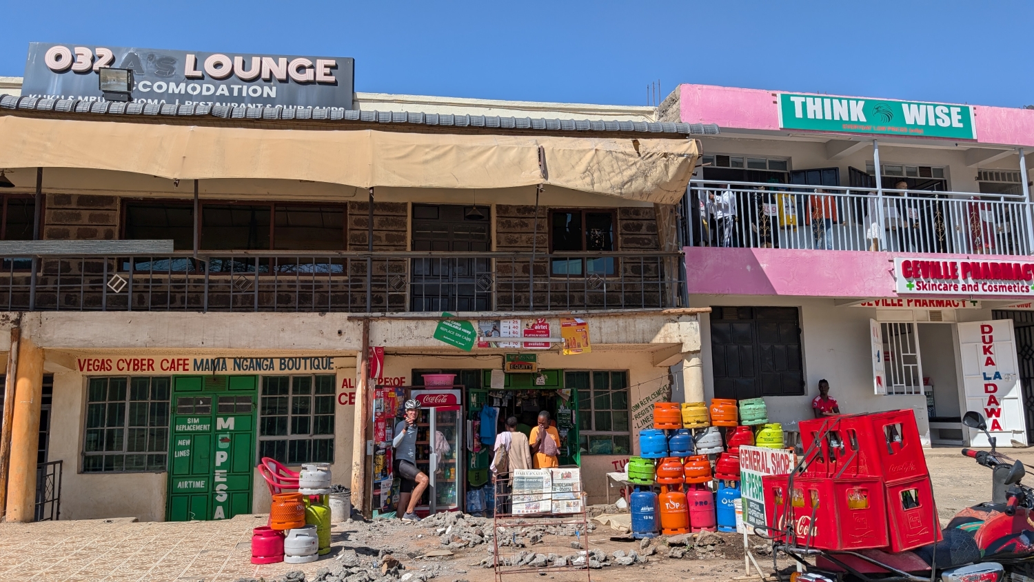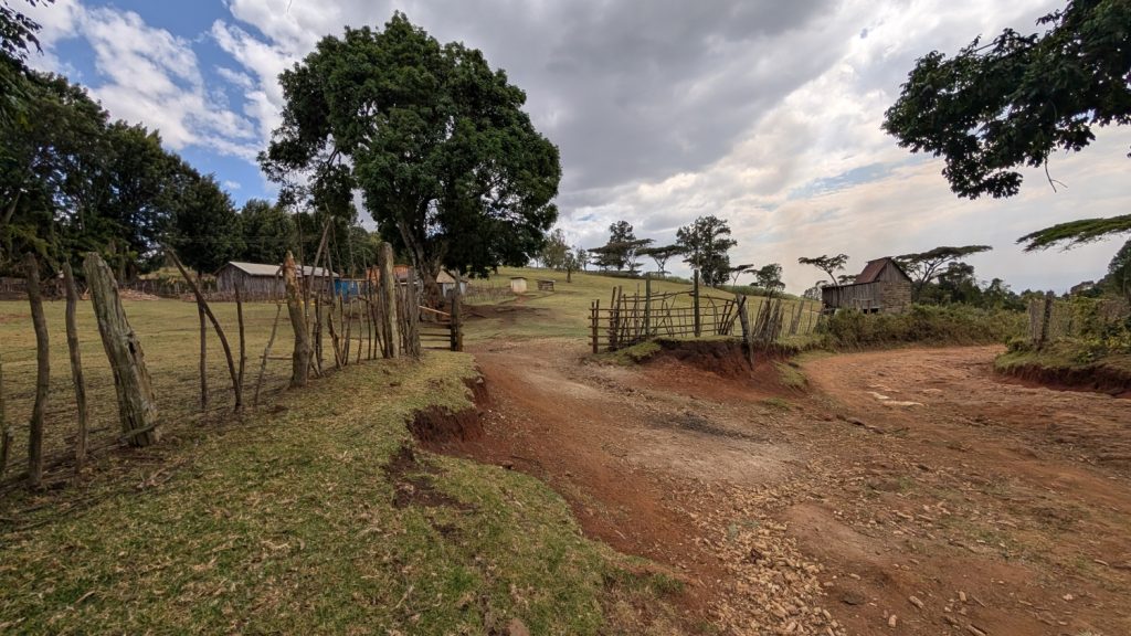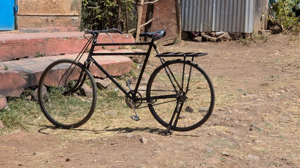 Am Eingang zum Sambusoy Conservancy bogen wir wieder auf den Track ein und verließen die Straße. Nach wenigen Metern wollte uns ein indischstämmiger Einwohner seinen Dienst gegen Geld anbieten. Er meinte es sei schwierig sich zu orientieren und er könne uns zeigen, wo wir am besten langradeln könnten. Na immerhin fragte er nach bezahlter Arbeit und nicht direkt nach Geld. Wir zogen weiter und leicht wellig verlief die Schotterstraße weiter gen Norden nach Mbaruk. Ab da begann der nächste richtige Anstieg, teilweise recht steil. Wir profitierten von den ausgelegten Betonplatten und gönnten uns im oberen Ortsteil von Mbaruk ein kleine Cola und Mango-Pause. Im Schatten sitzend beobachteten wir das Dorftreiben gegenüber einer Bar und Schweißerei. Ich tippe dass dort unter anderem die breiten Gepäckträger geschweißt wurden. Es kamen auch mal Einwohner vorbei, die nach Geld fragten. An den Anblick, dass jemand mit seiner Machete vor uns steht und nach Geld fragte gewöhnten wir uns so langsam, schließlich war das ein wichtiges Utensil bei der Feldarbeit.